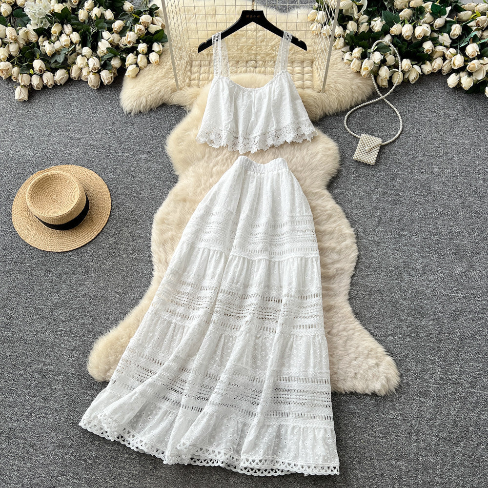 Small-Scale Vintage Hollow Crocheted Shoulder Sling Knitted Shirt Two Sets Of Women's Half-Dress