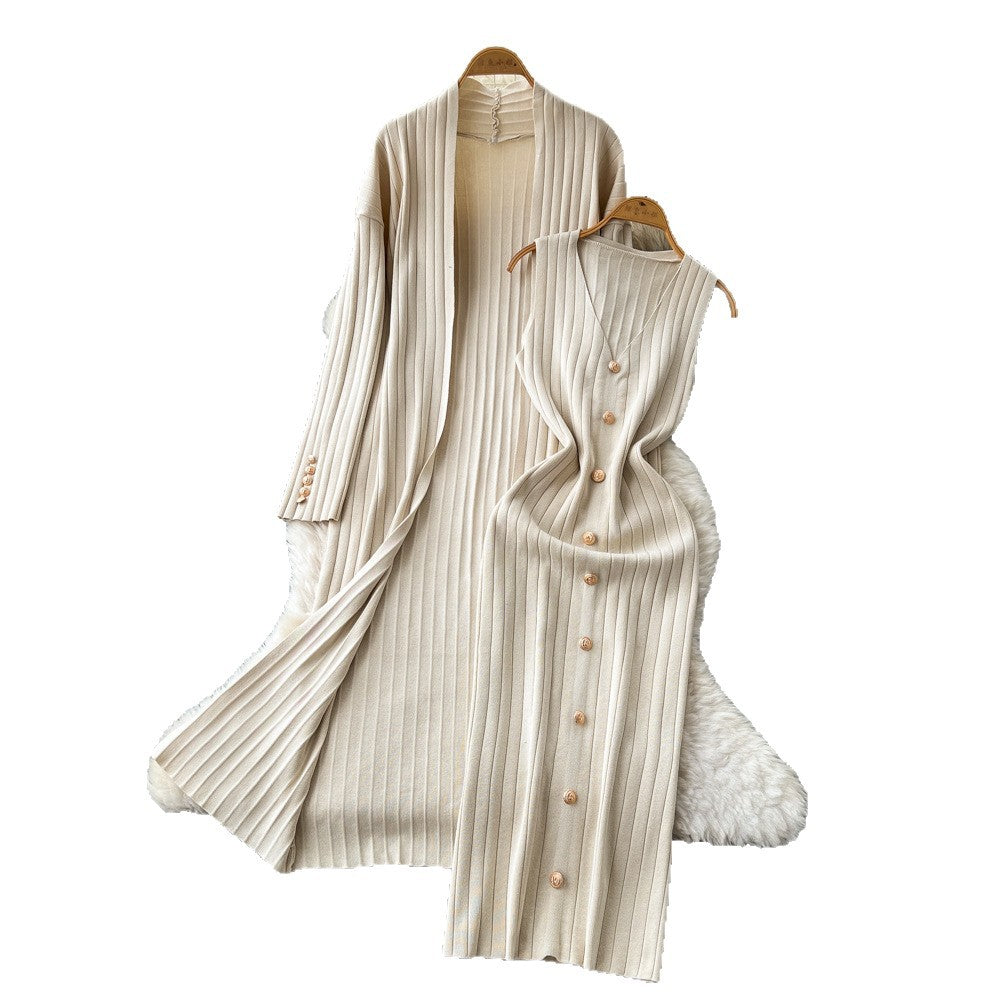 Cincupies Senior Sense Loose External Medium And Long Knitted Cardigan Jacket + Sleeveless Metal Buckle Joint Skirt