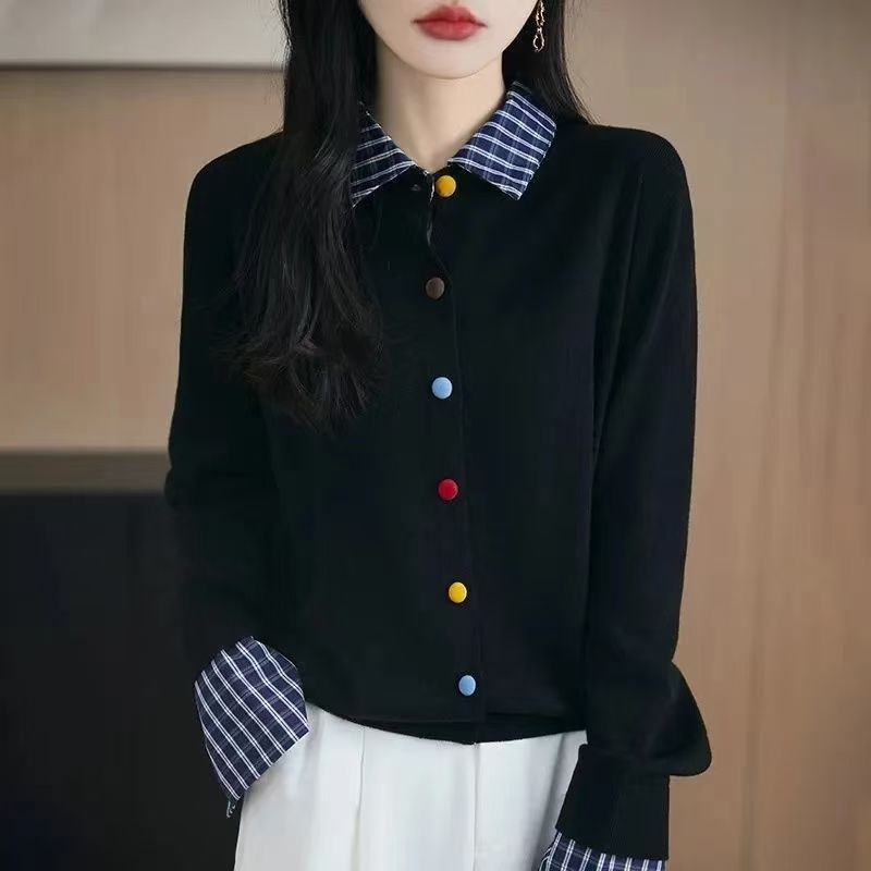 Autumn And Winter Knitted Open Shirt Two Lattice Collar Shirt Early Spring New Color Fashion Splicing Coat Sweater