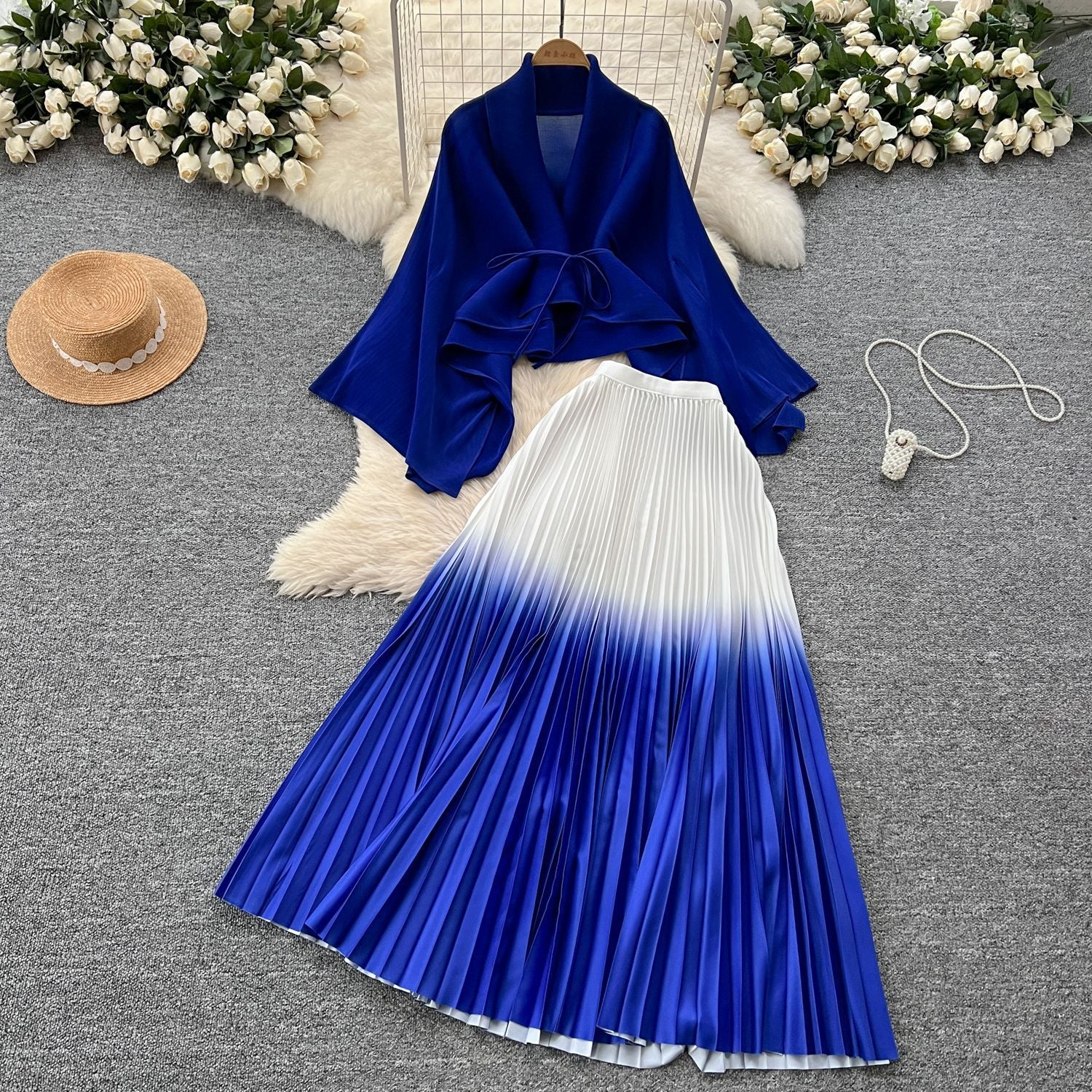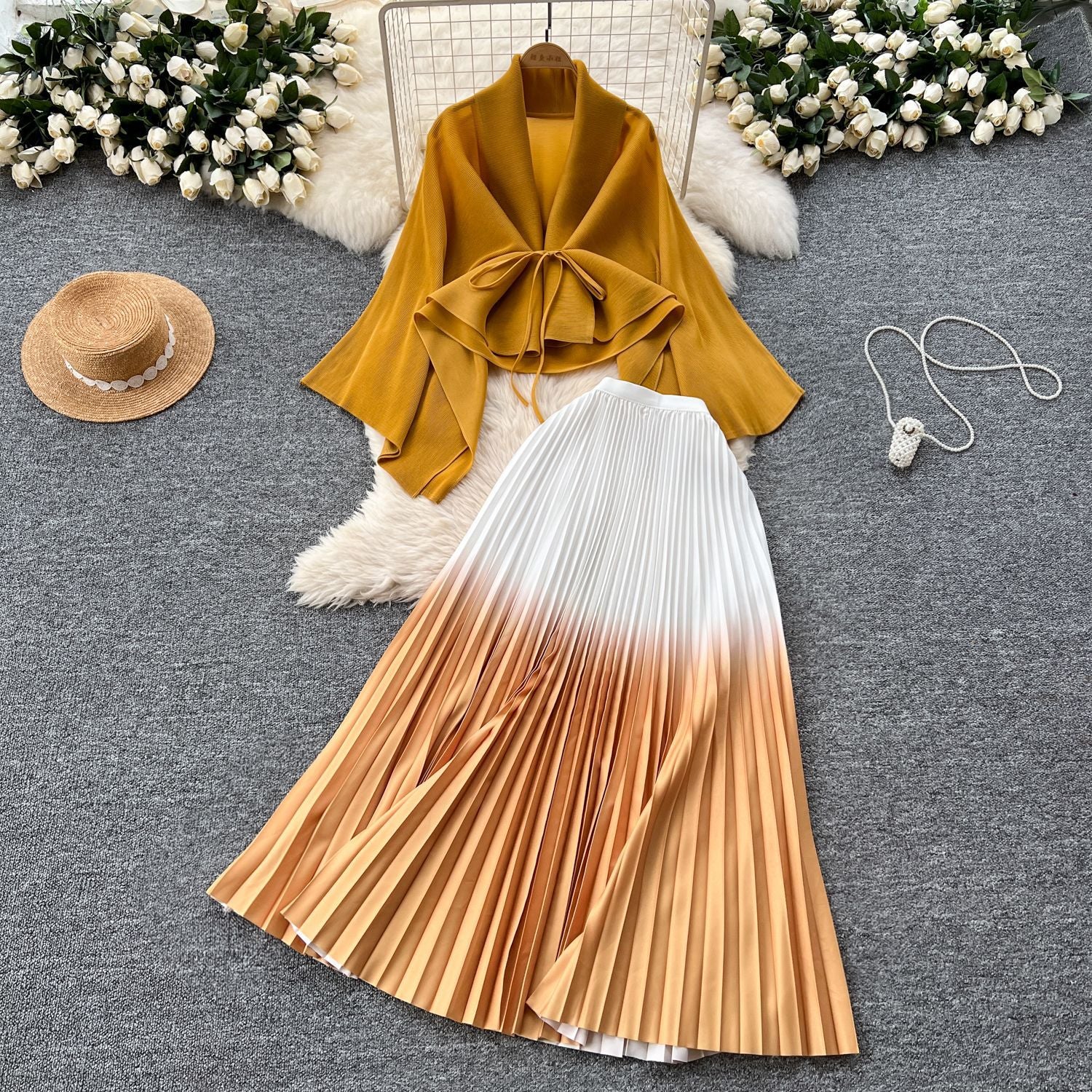 Miyajie Wrinkled Butterfly Sleeve Gradient With Shawl Short Coat Top + Gradient 100 Folded Skirt Two-Piece Suit