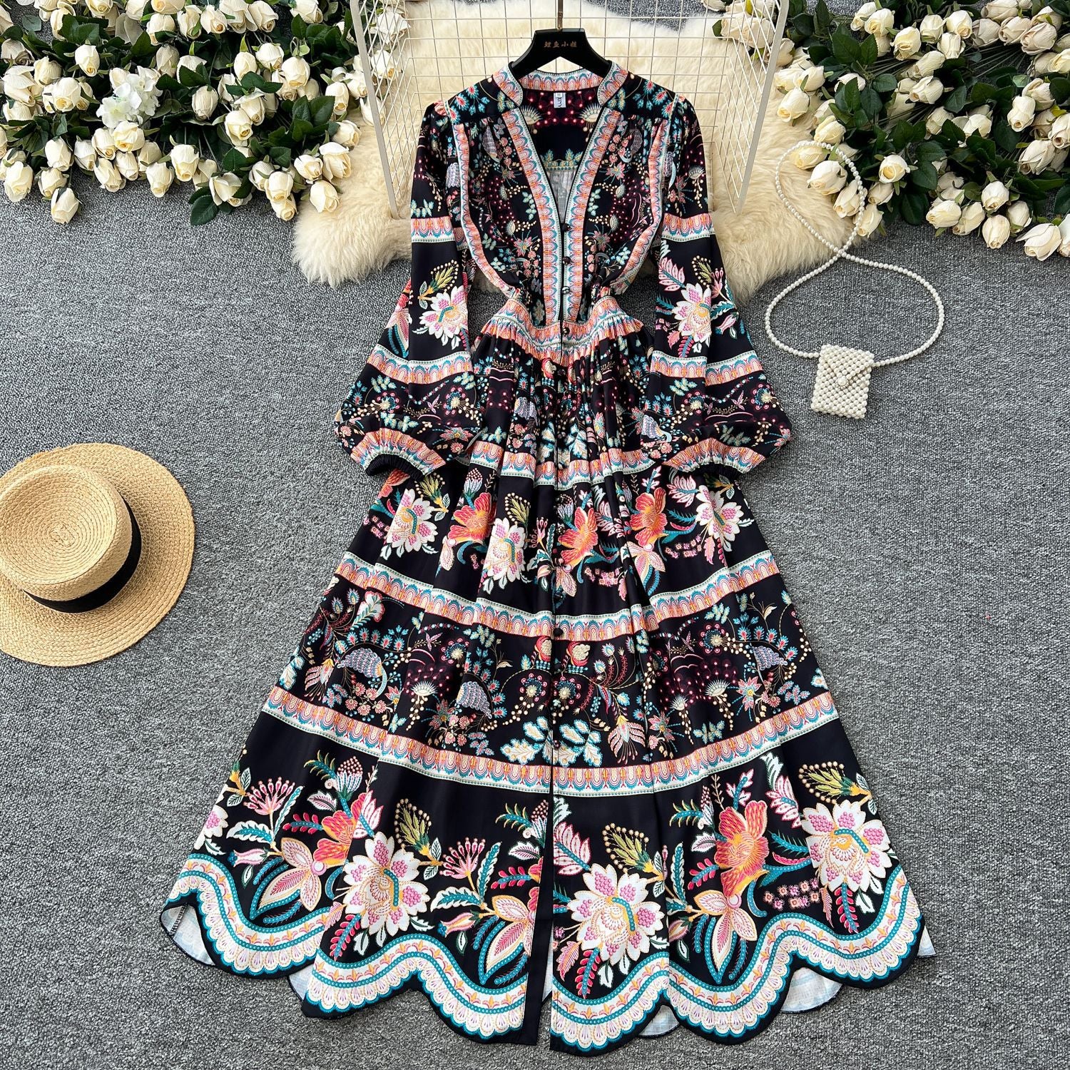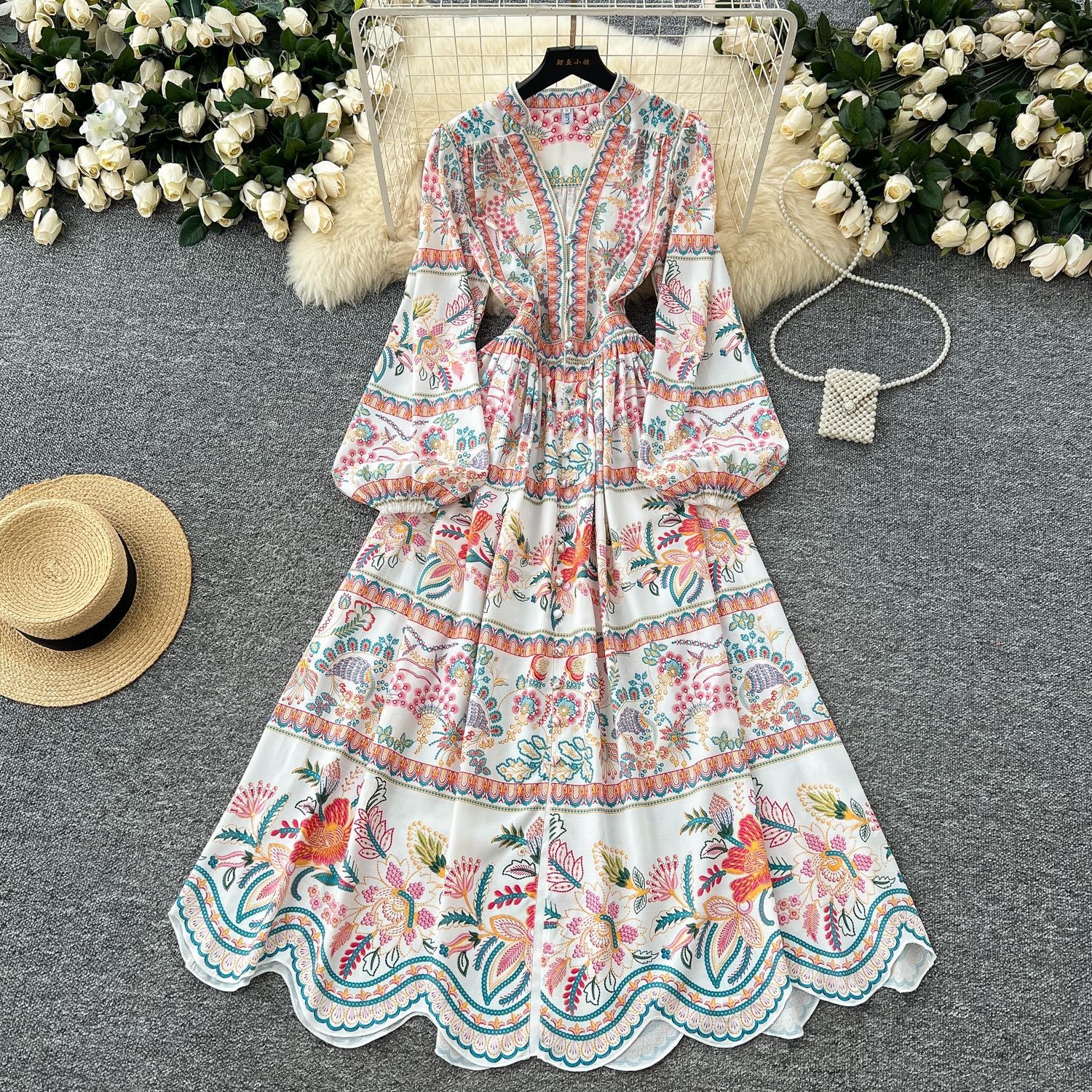 Famous Vintage Printed Dresses Women's New Spring 2025 New Waist Temperament V-Neck Single-Rece Buckle Long Dress
