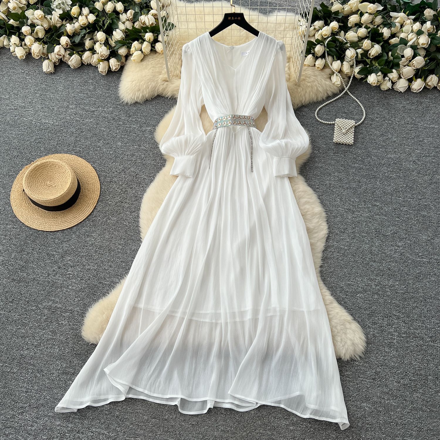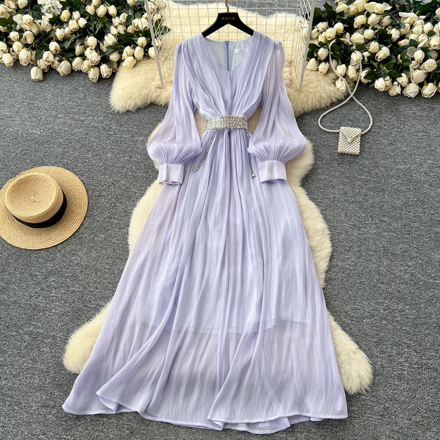 French High-End Temperament Fashion V-Neck Lantern Sleeve Strap To Close Waistguel Dress Female Elegant Long Dress