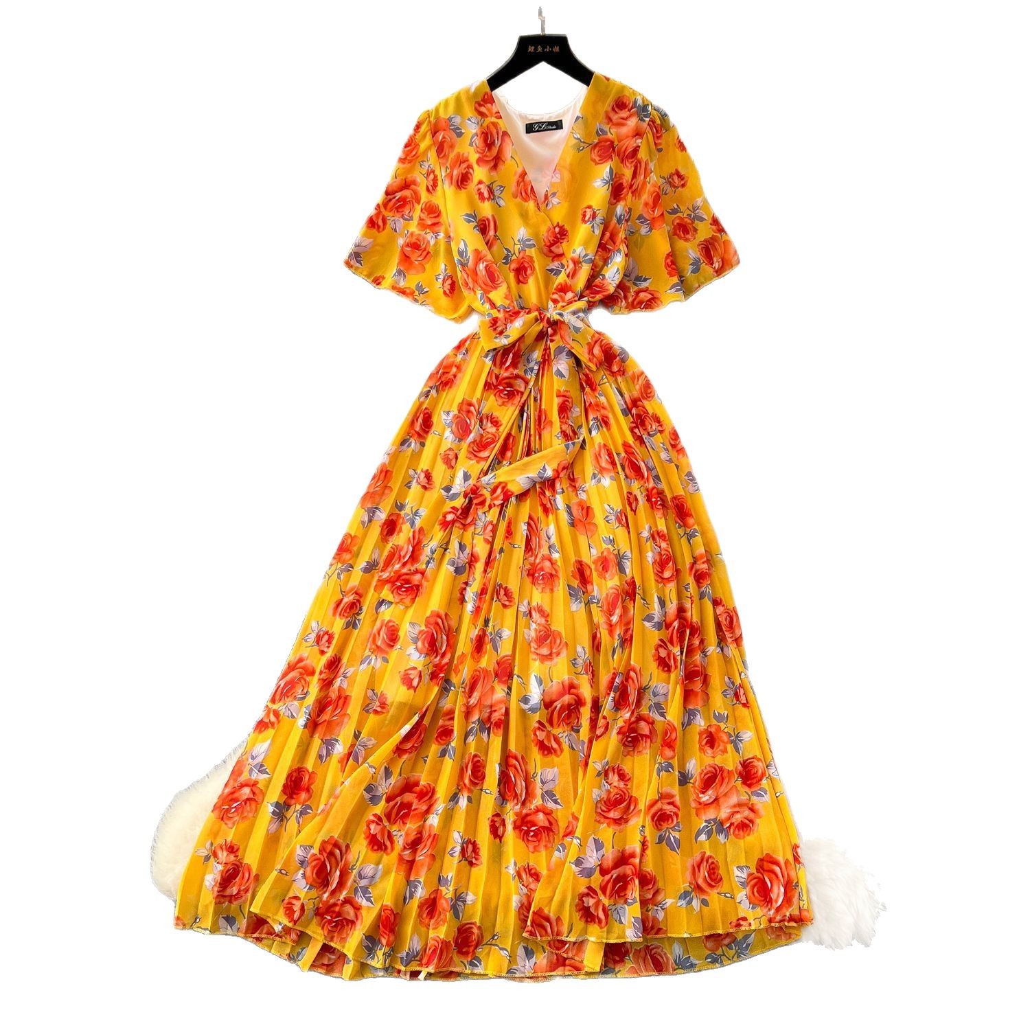 2025 Summer Dress New Female High-End Feel Strapped Belt V Collar Horn Sleeves Thin Temperament Print Chiffon Dress