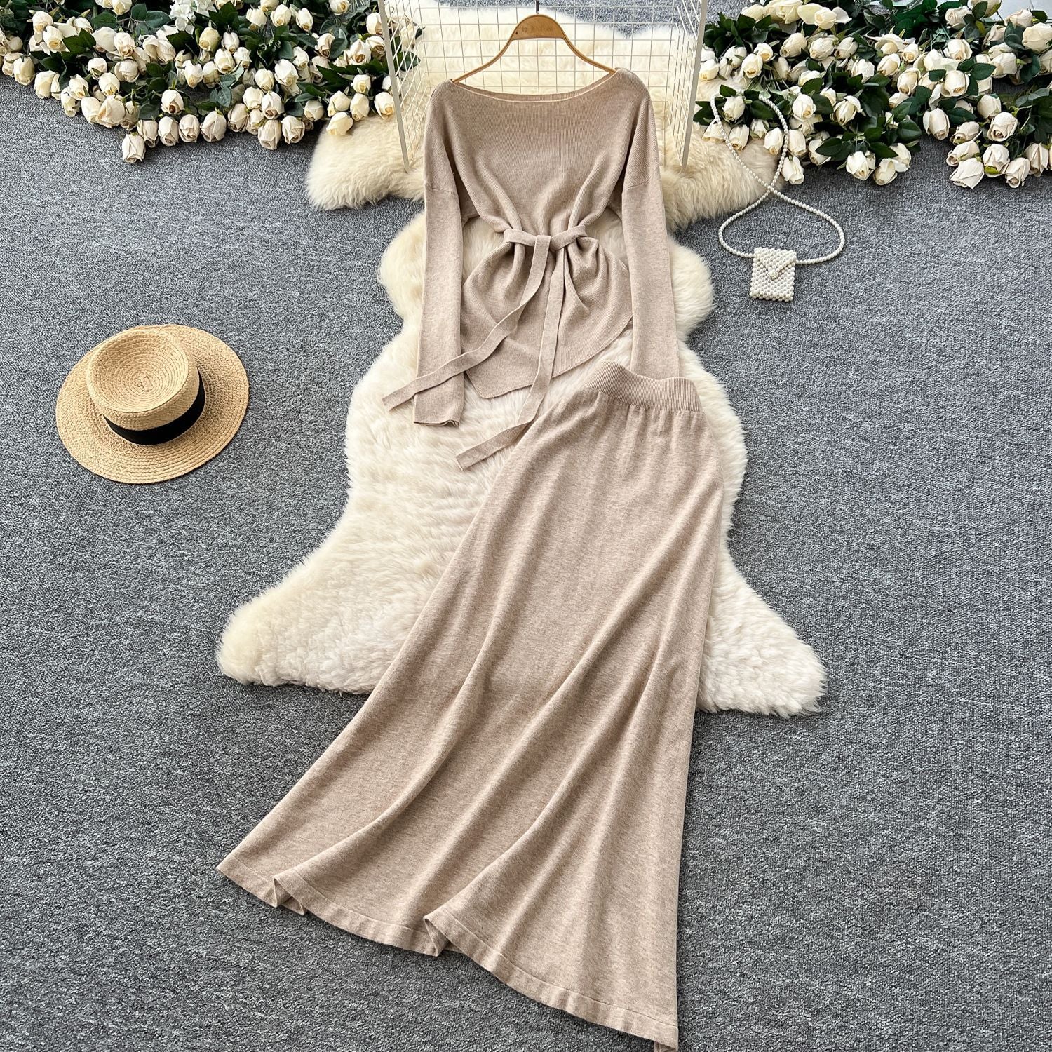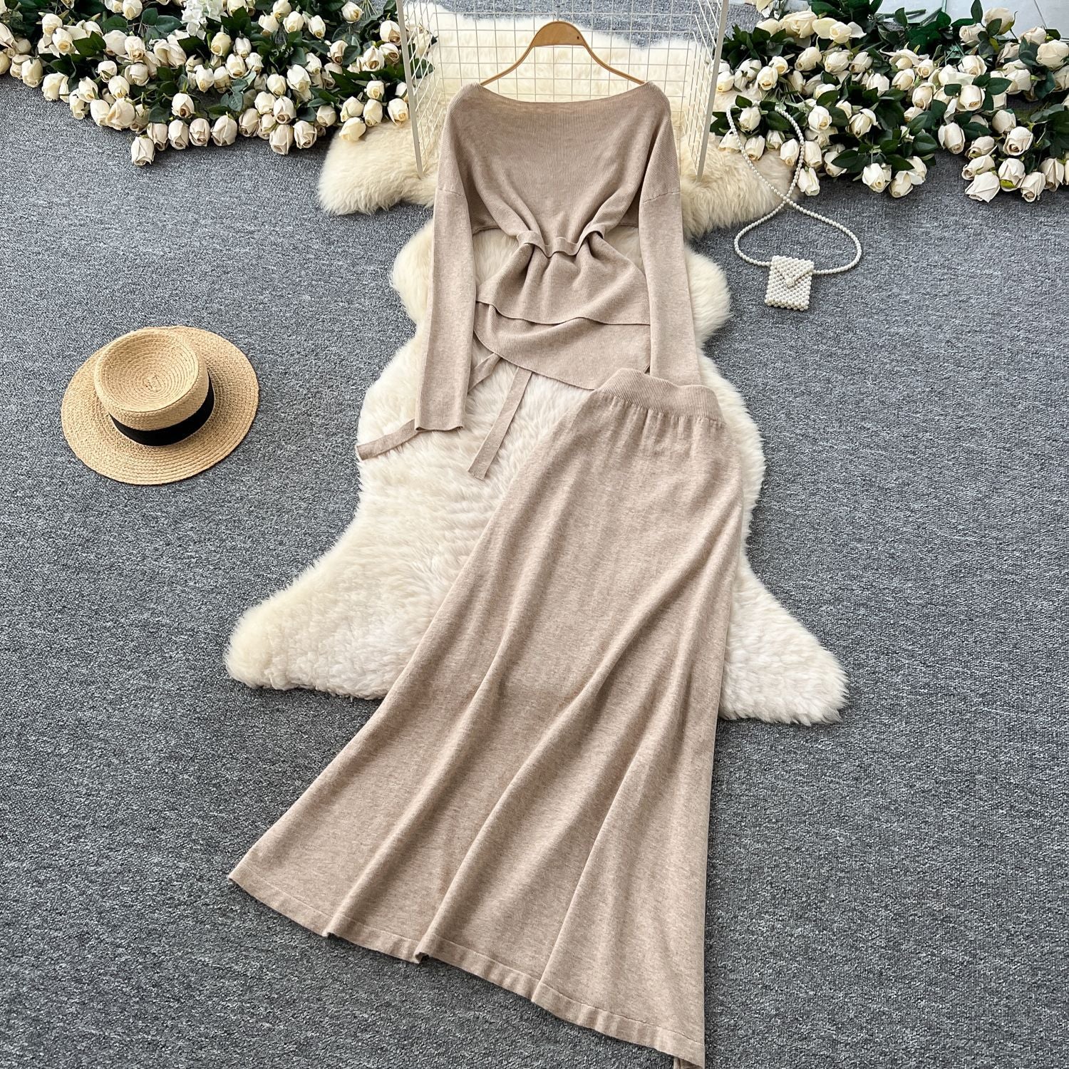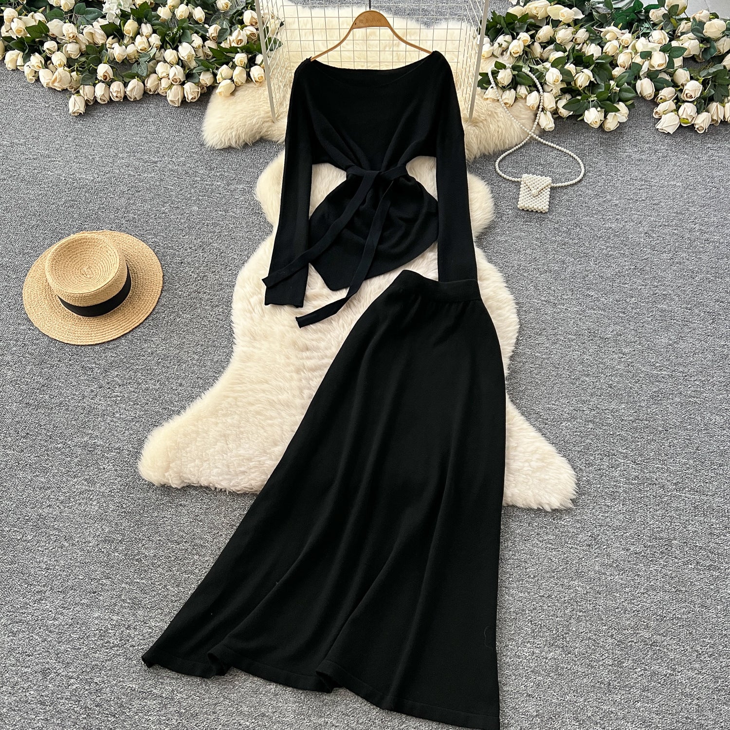 French Temperament Wears A Female Autumn And Winter Design Sense Of Irregular Strap To The Waist Long-Sleeved Knitted Shirt + High Waist Half-Dress
