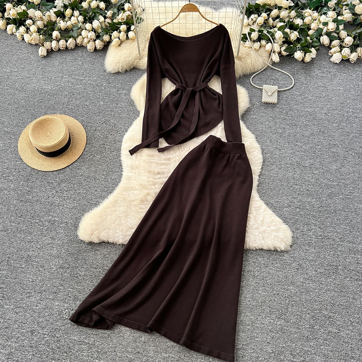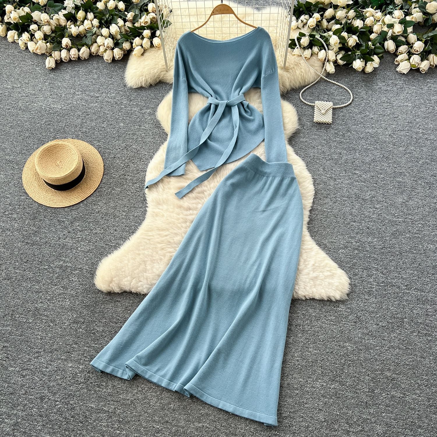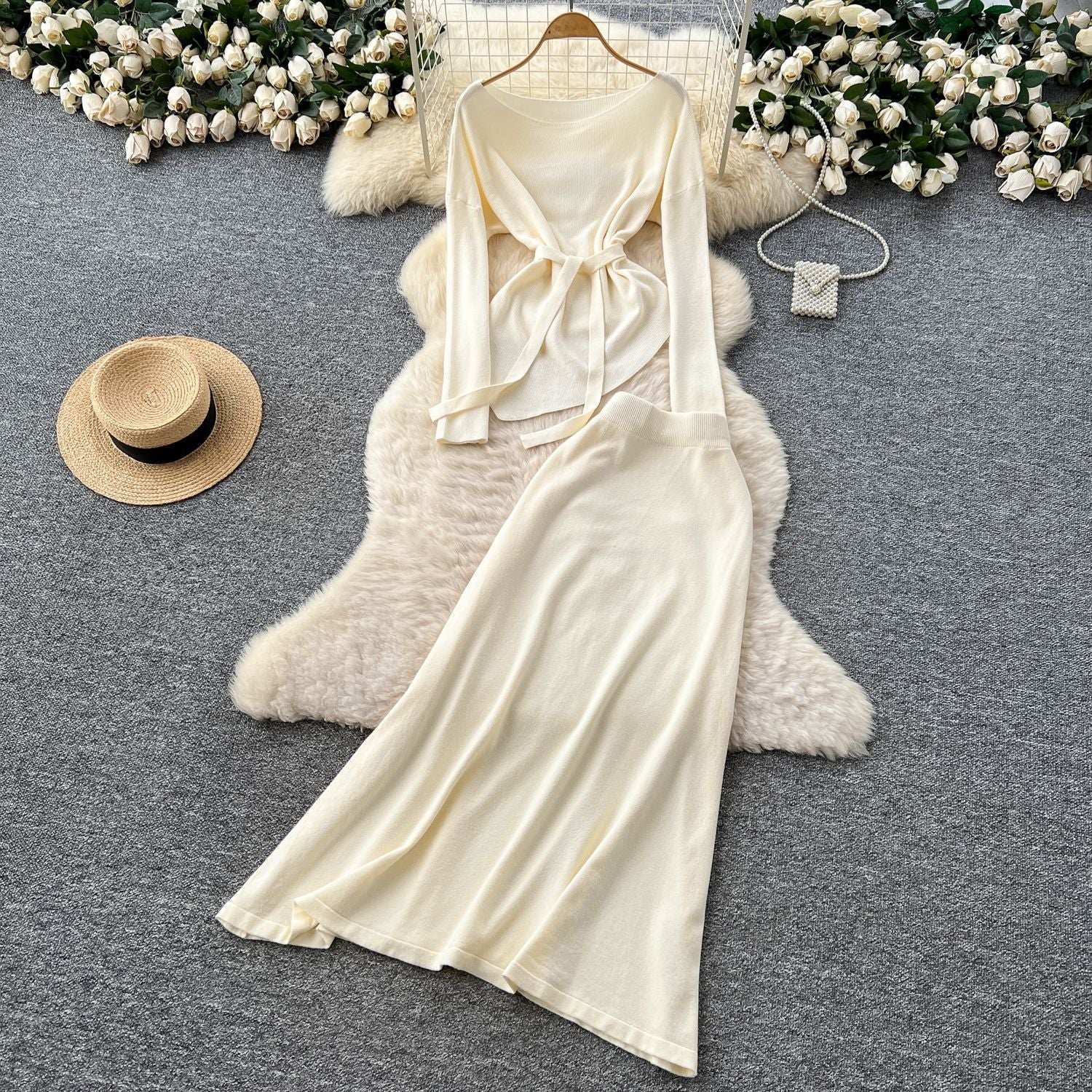 French Temperament Wears A Female Autumn And Winter Design Sense Of Irregular Strap To The Waist Long-Sleeved Knitted Shirt + High Waist Half-Dress