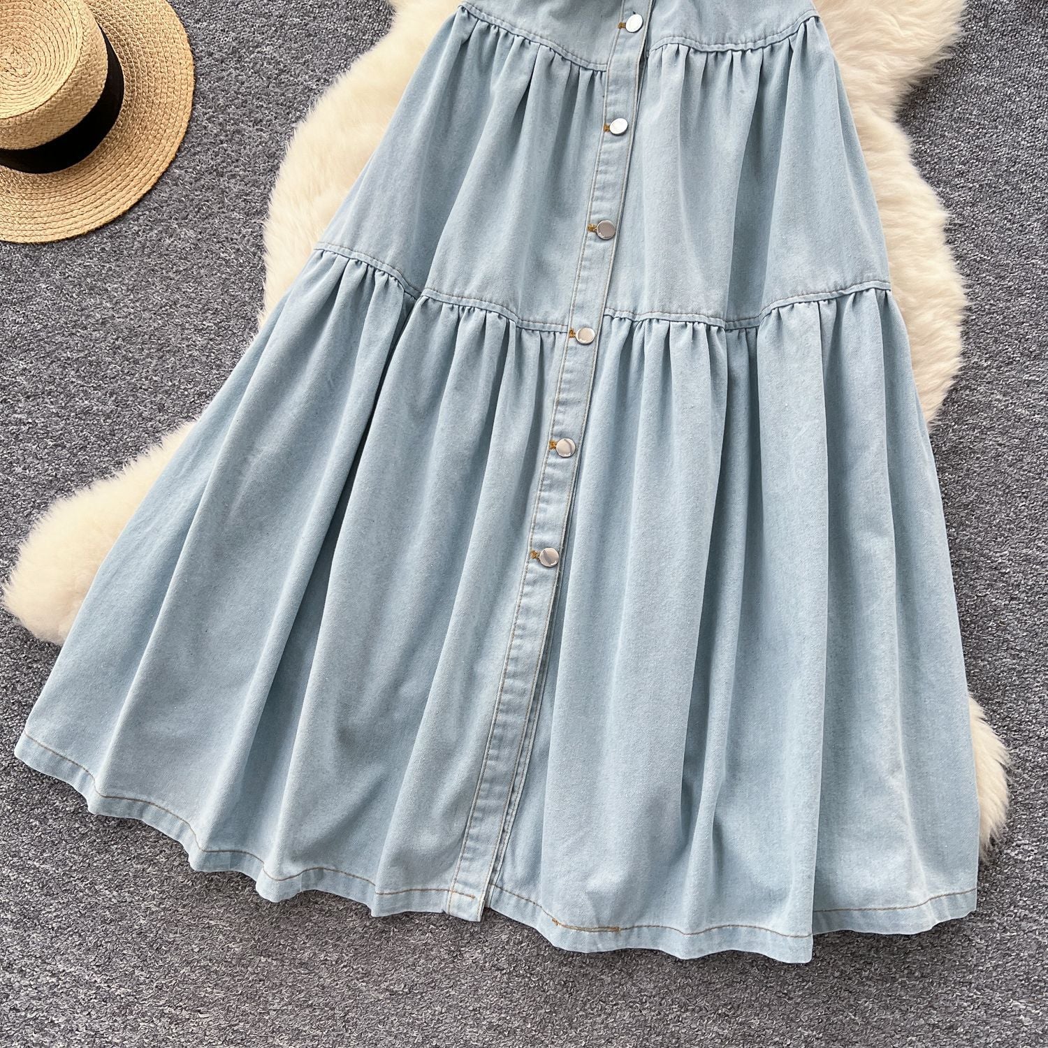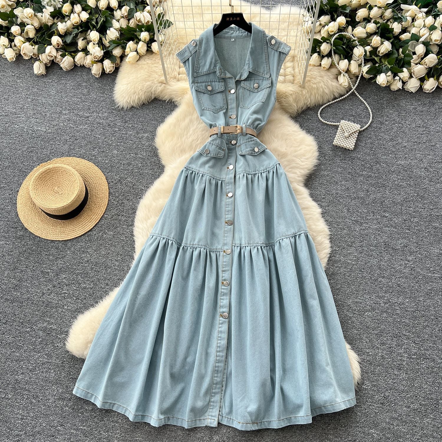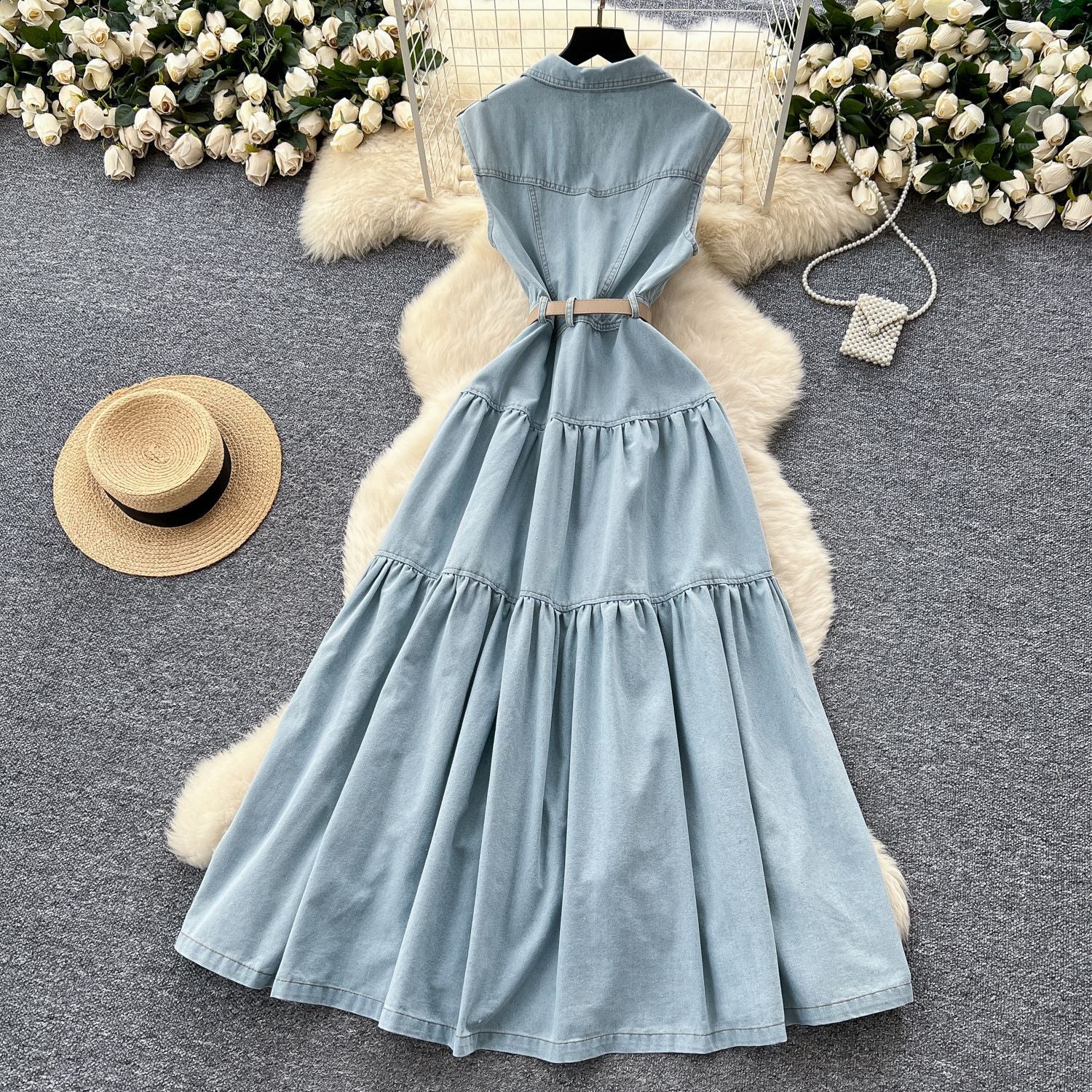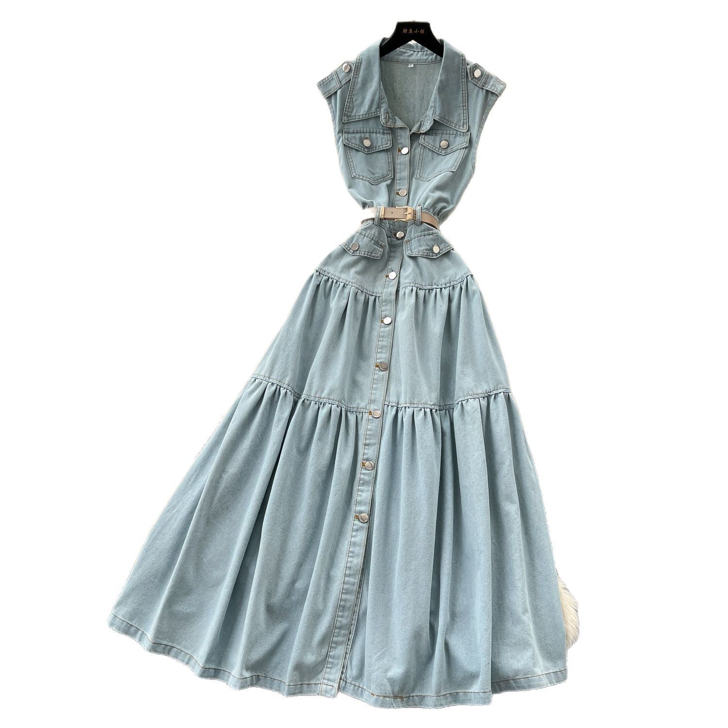 Light Ripe Wind Niche High-Grade Buckle Collar Sleeveless Roll-Lens Denim Dress Women's Summer Long Dress