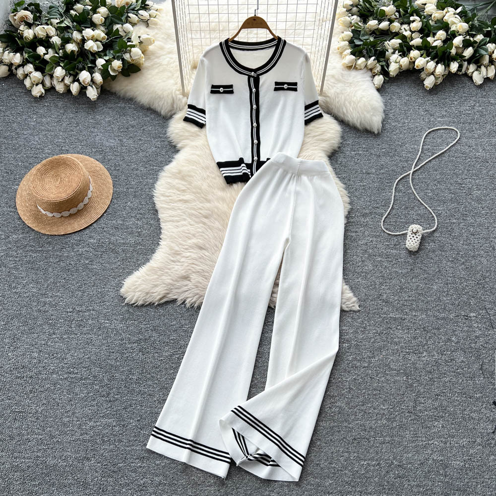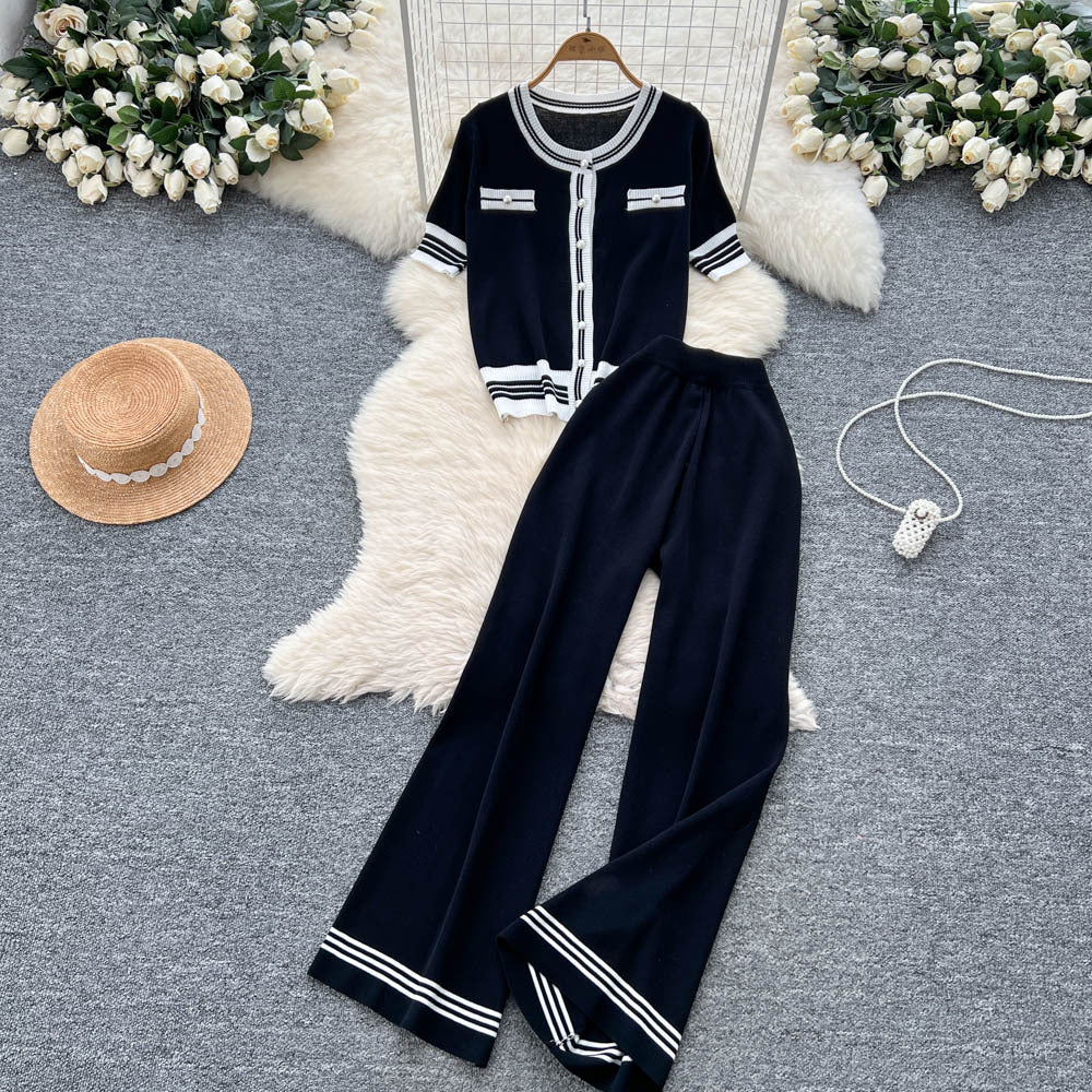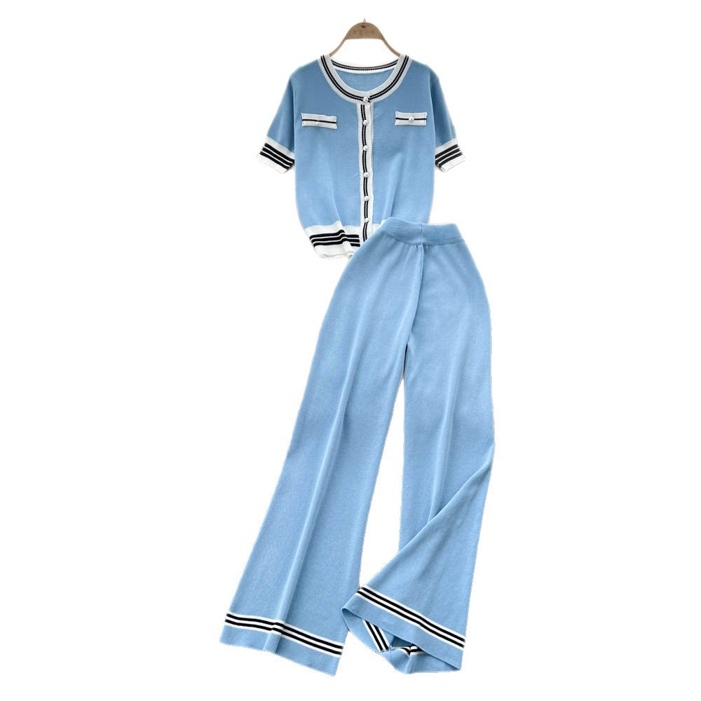 Small Fragrant Breeze Sleeze Sleeze Round-Neck Collar Knitted Top Women High-Waisted Leisure Broad-Legged Pants Summer Suit