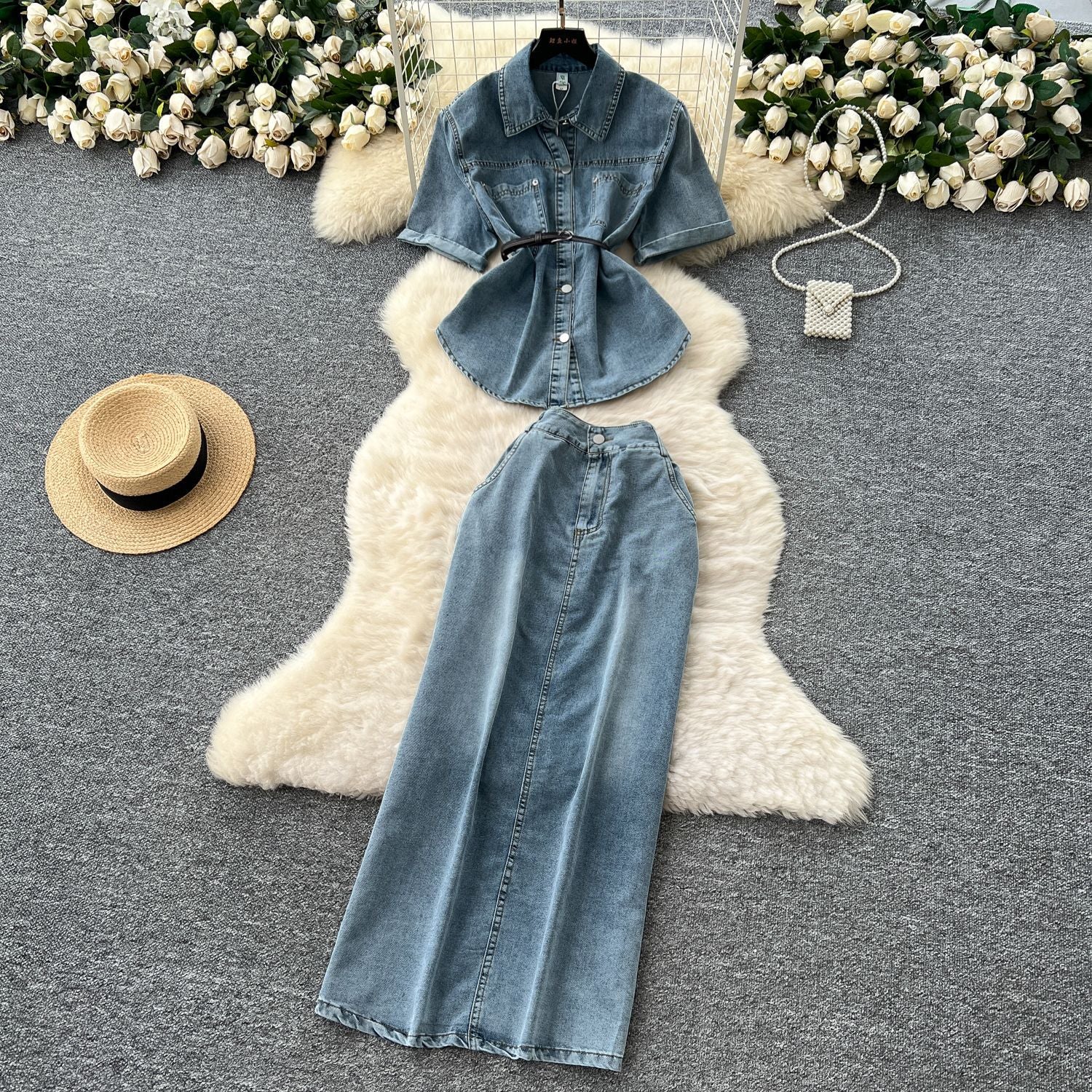 French Light-Cooked Wind Strap To Close Waist Short-Sleeved Cowboy Topess Female High-Waisted Fork Hip Skirt Summer Two-Sleeve