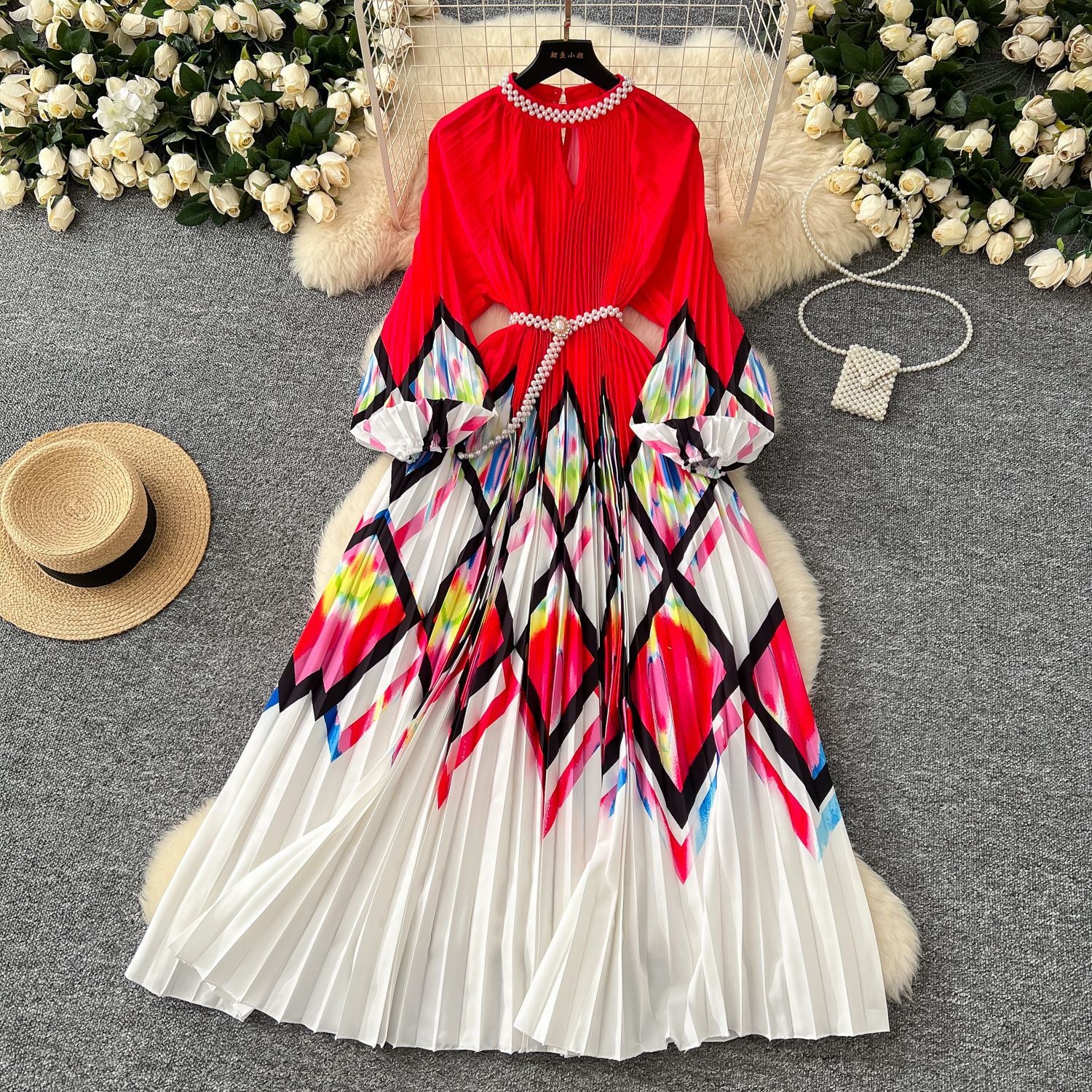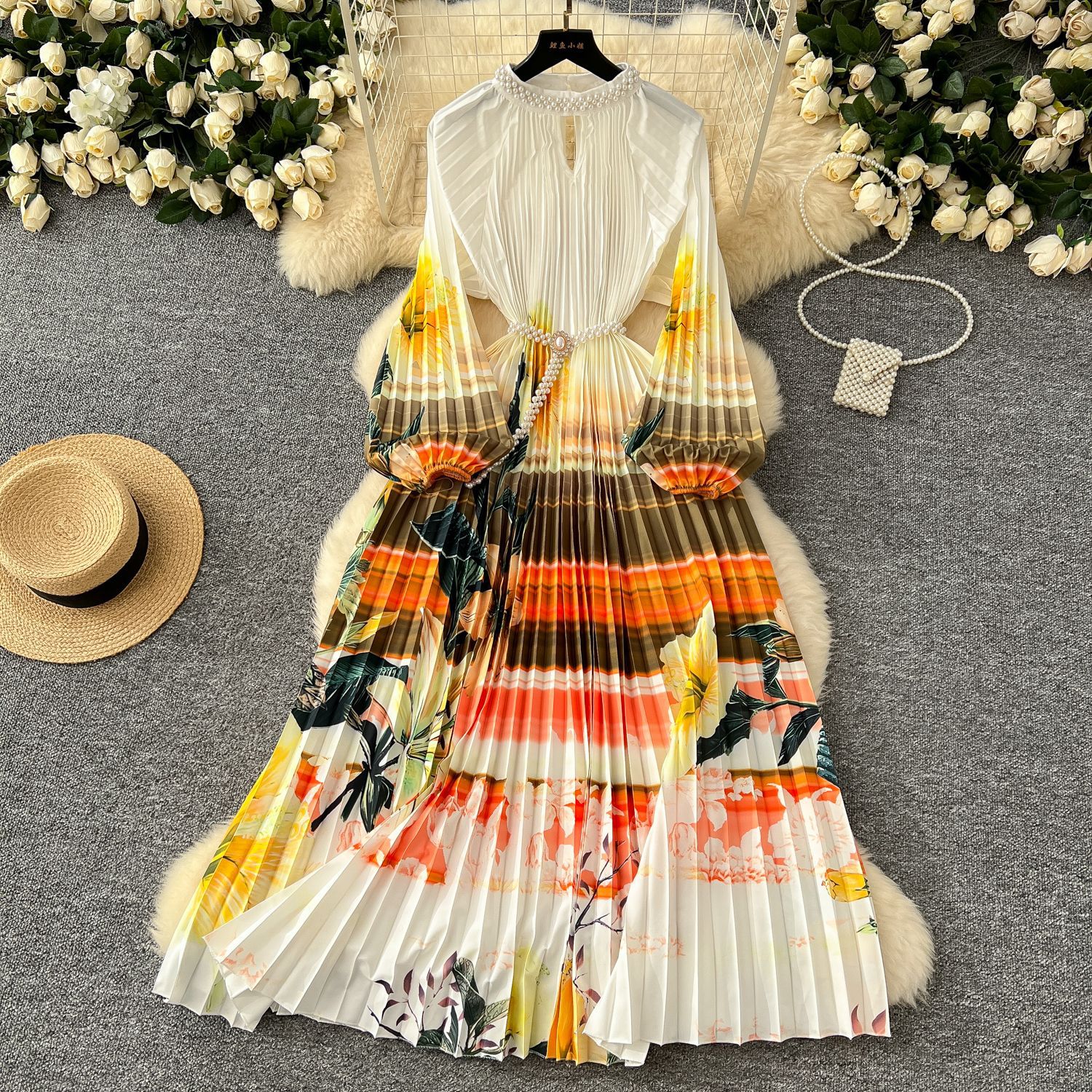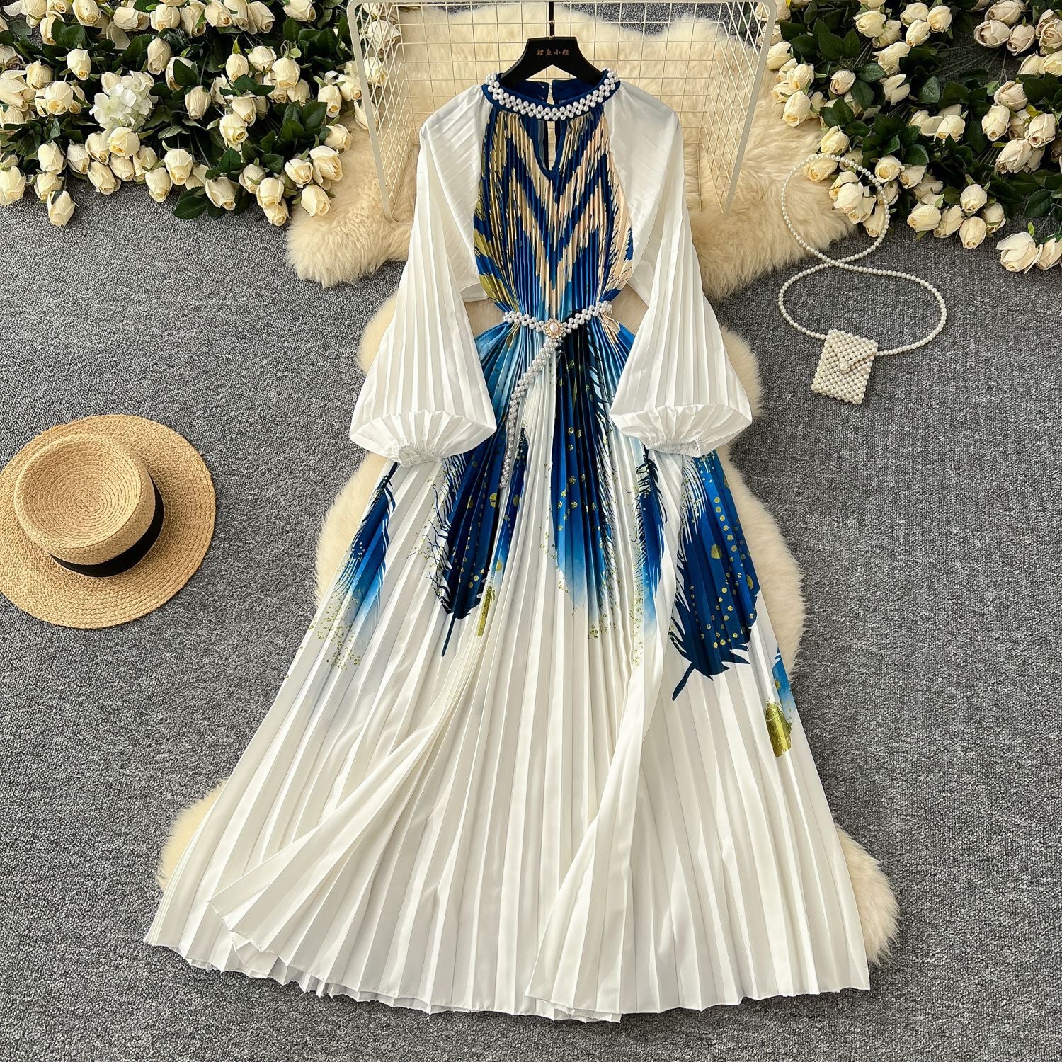 High-Grade Collar Nail Bead Lantern Sleeve Pearl Belt To Collect Long-Term Printed Pressure Skirt