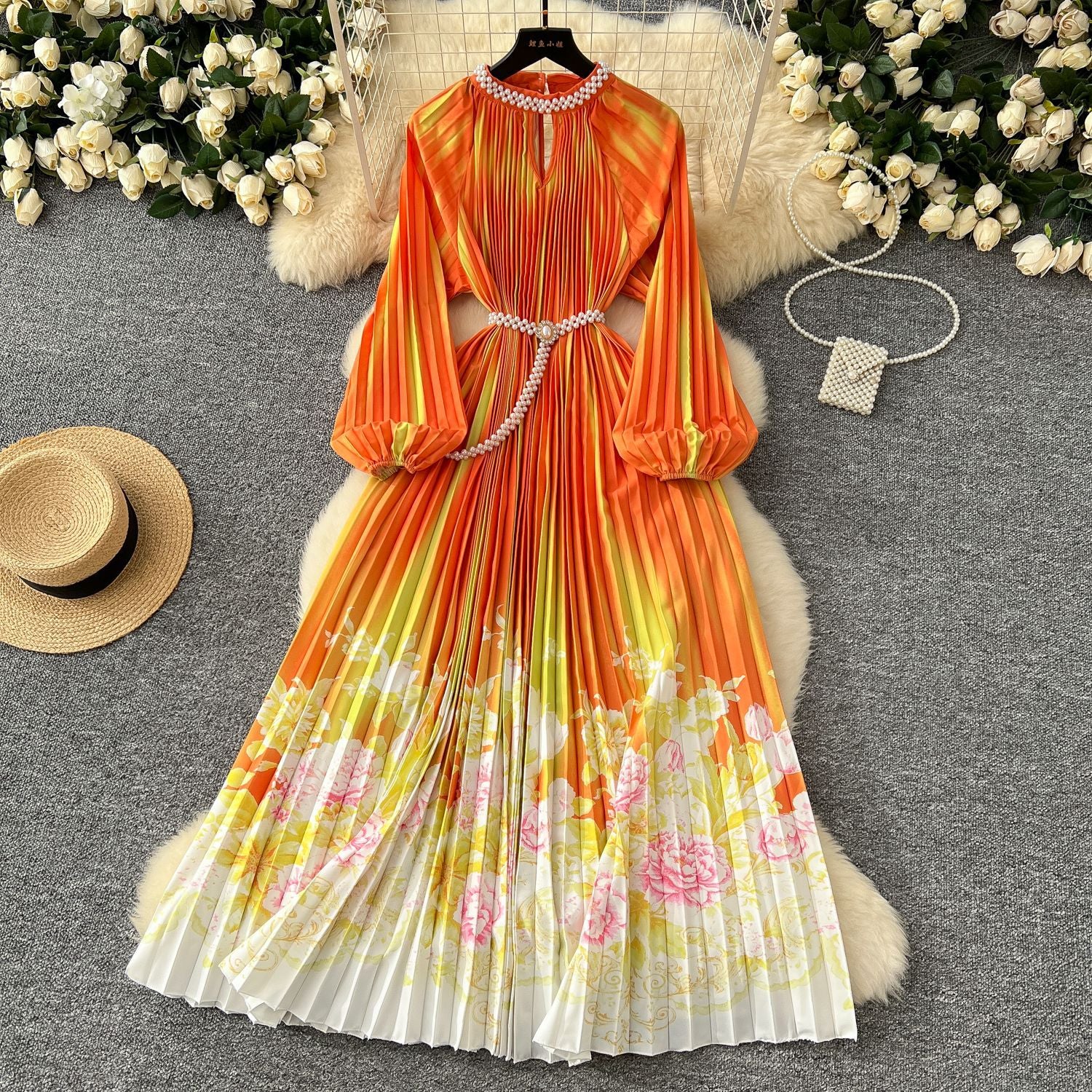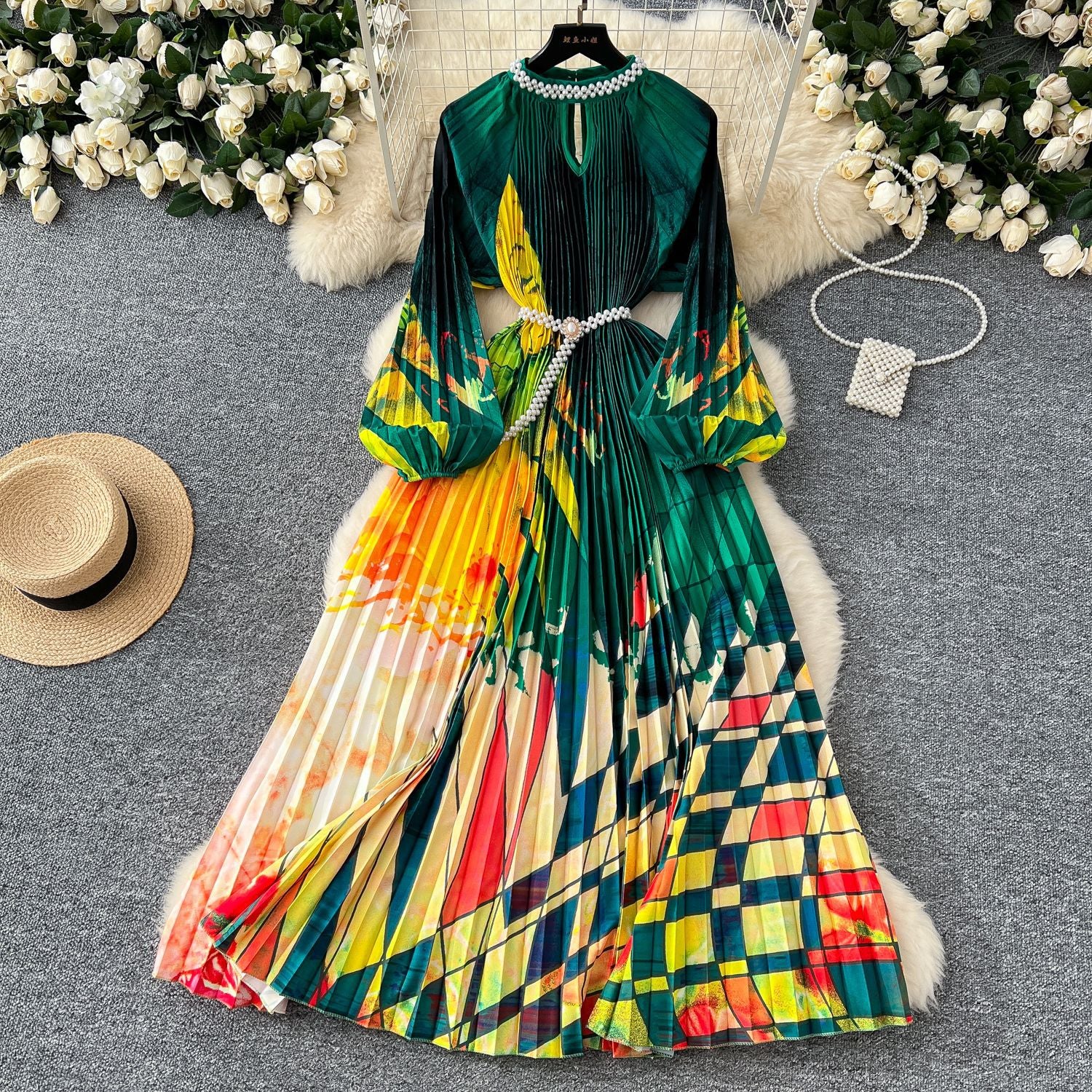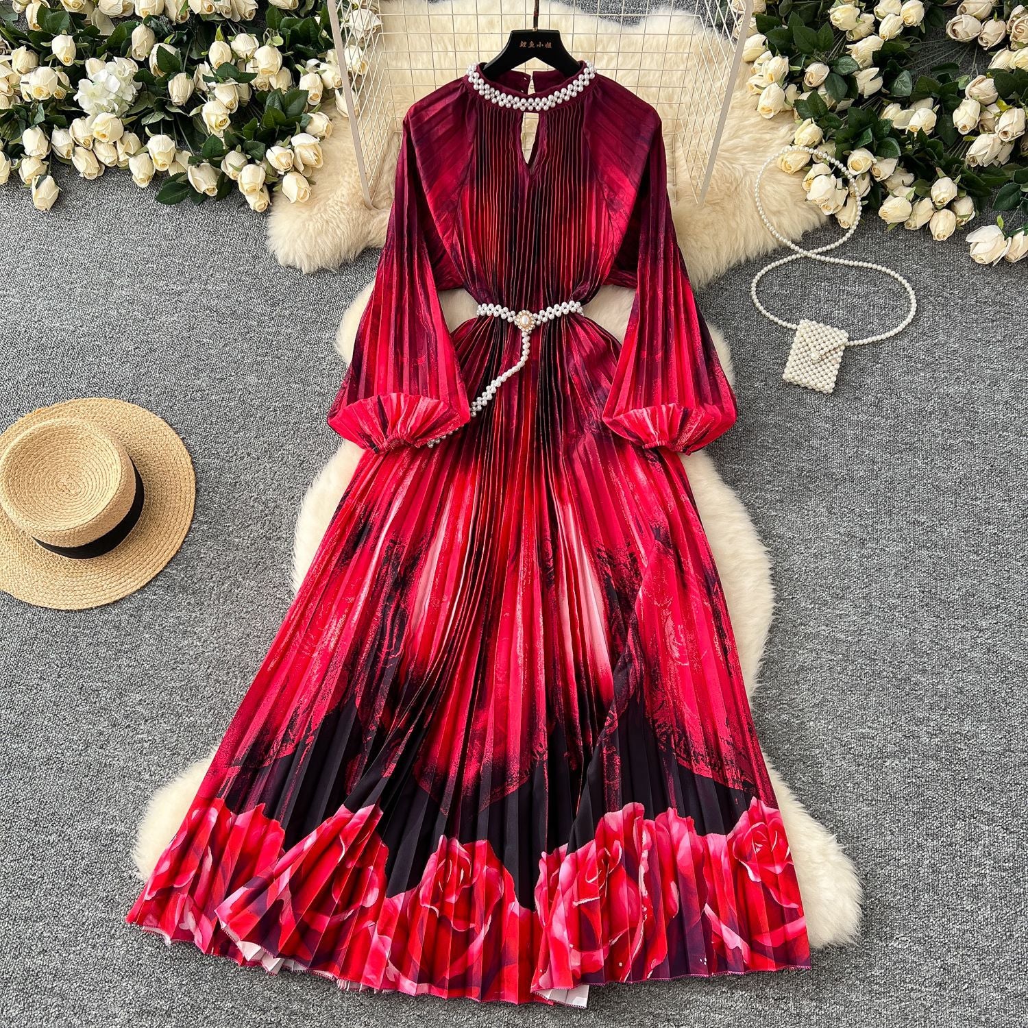 High-Grade Collar Nail Bead Lantern Sleeve Pearl Belt To Collect Long-Term Printed Pressure Skirt