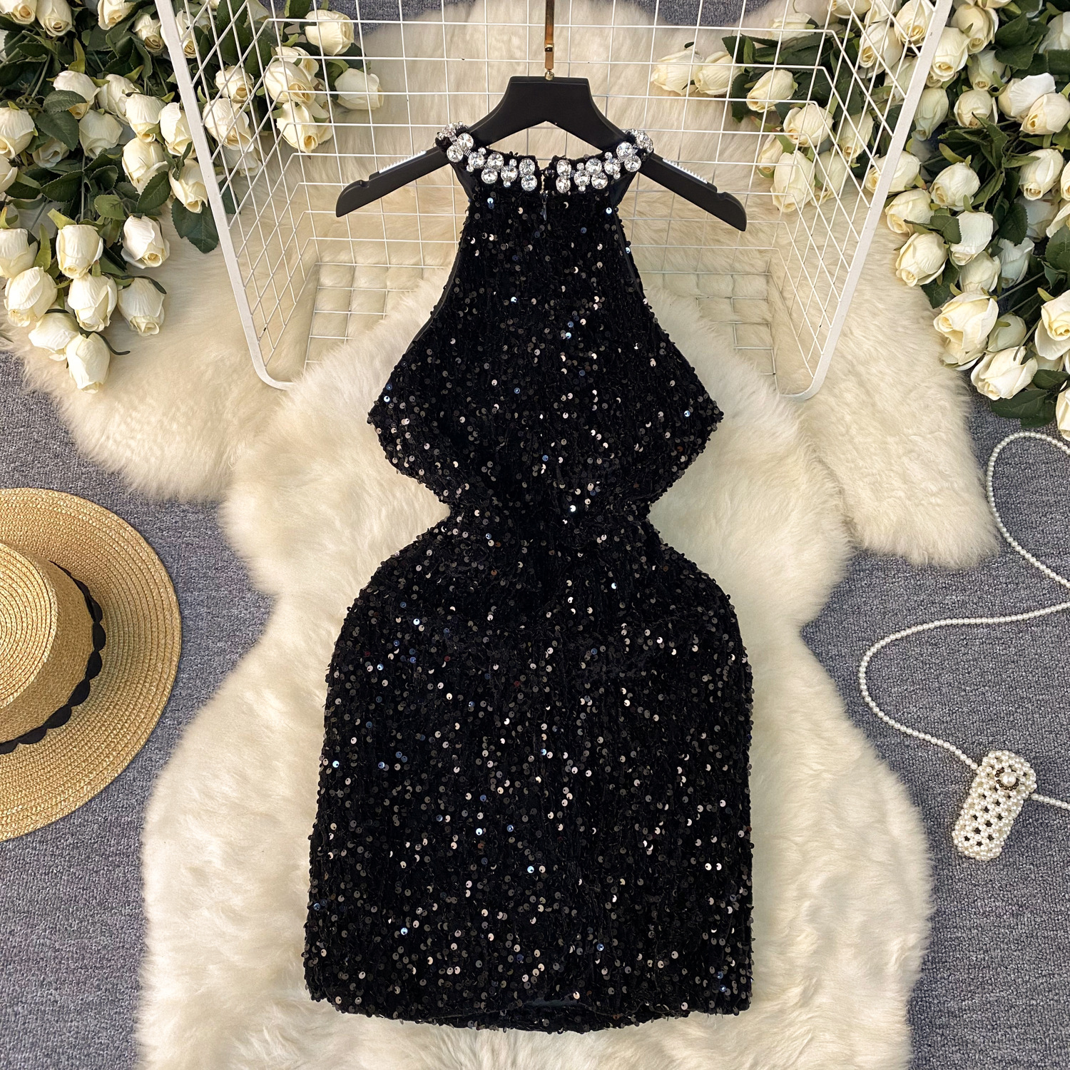 Light Luxury Thousand Gold Wind High-End Hanging Neck Dress Women's Summer Glide Diamond Design Niche Temperament Ass And Hip Skirts