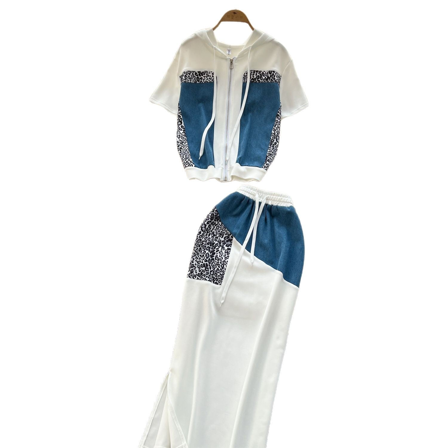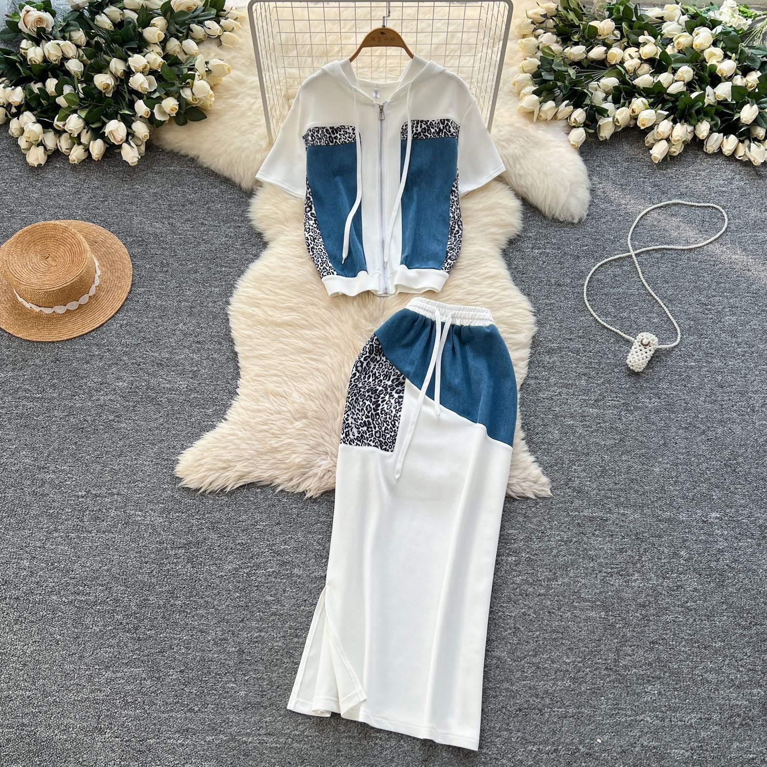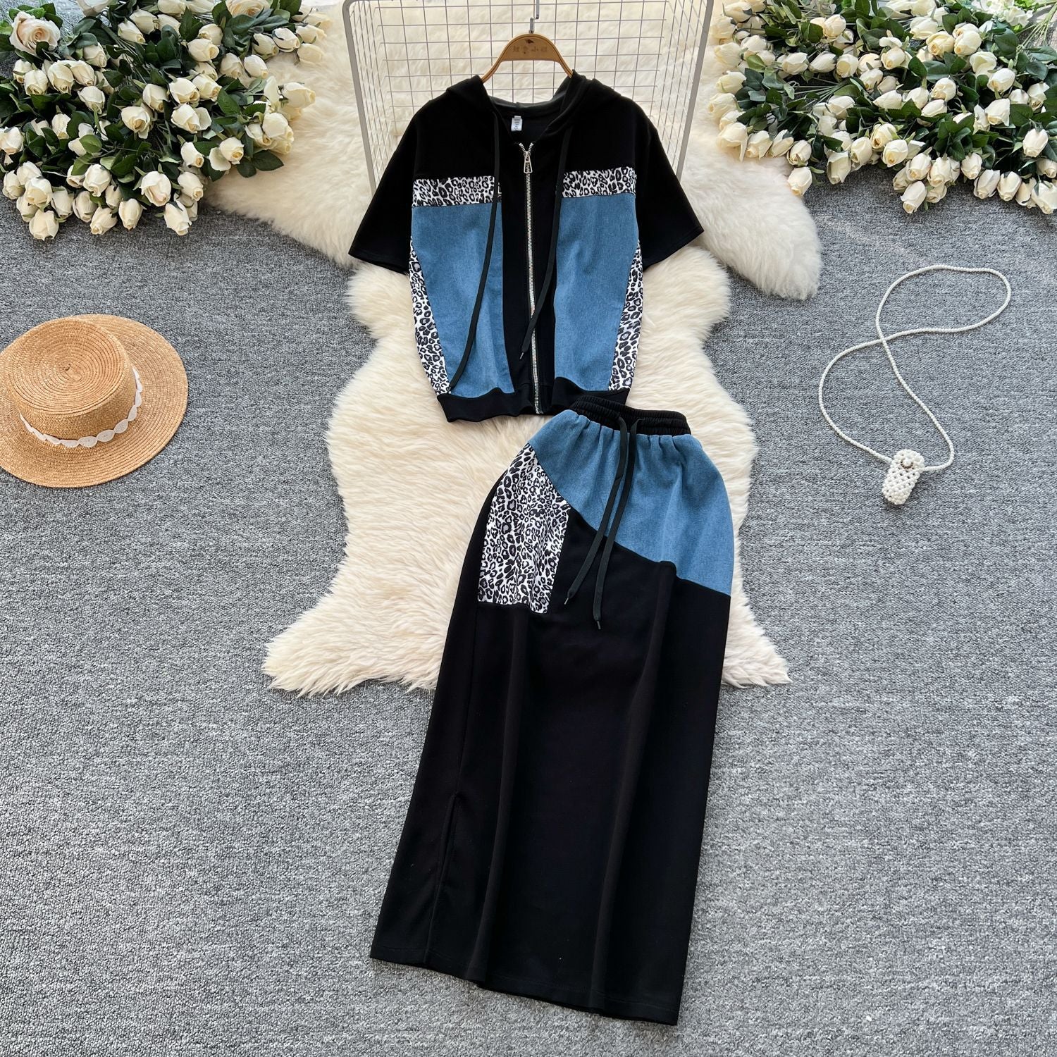 This Year's Popular Suit Women's Summer Fashion Leopard-Print Spliced Hat Jacket High-Waisted Open-Back Hip Skirt Suit