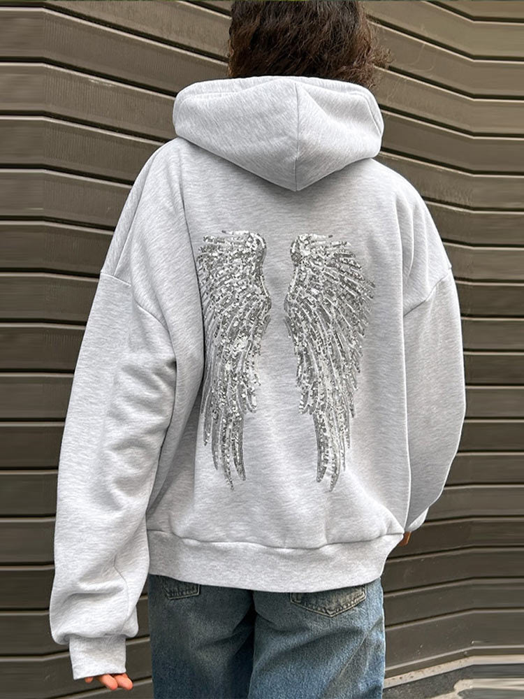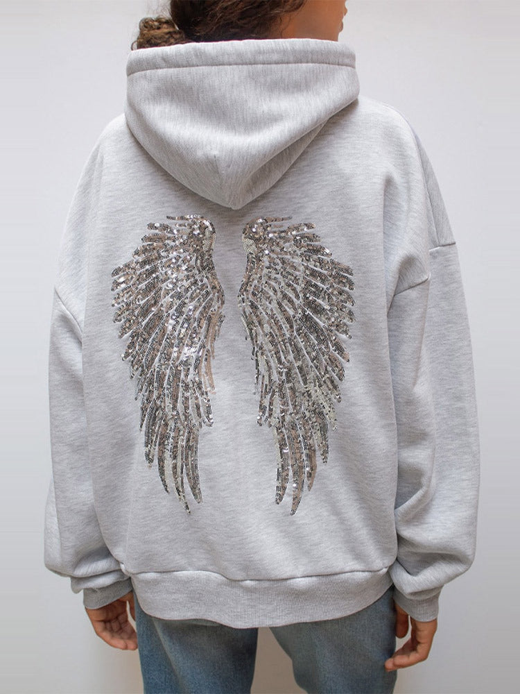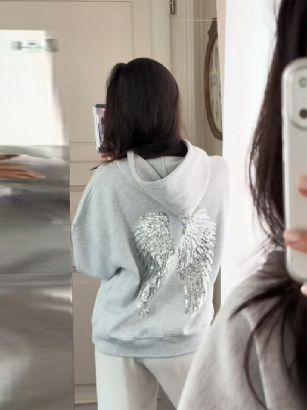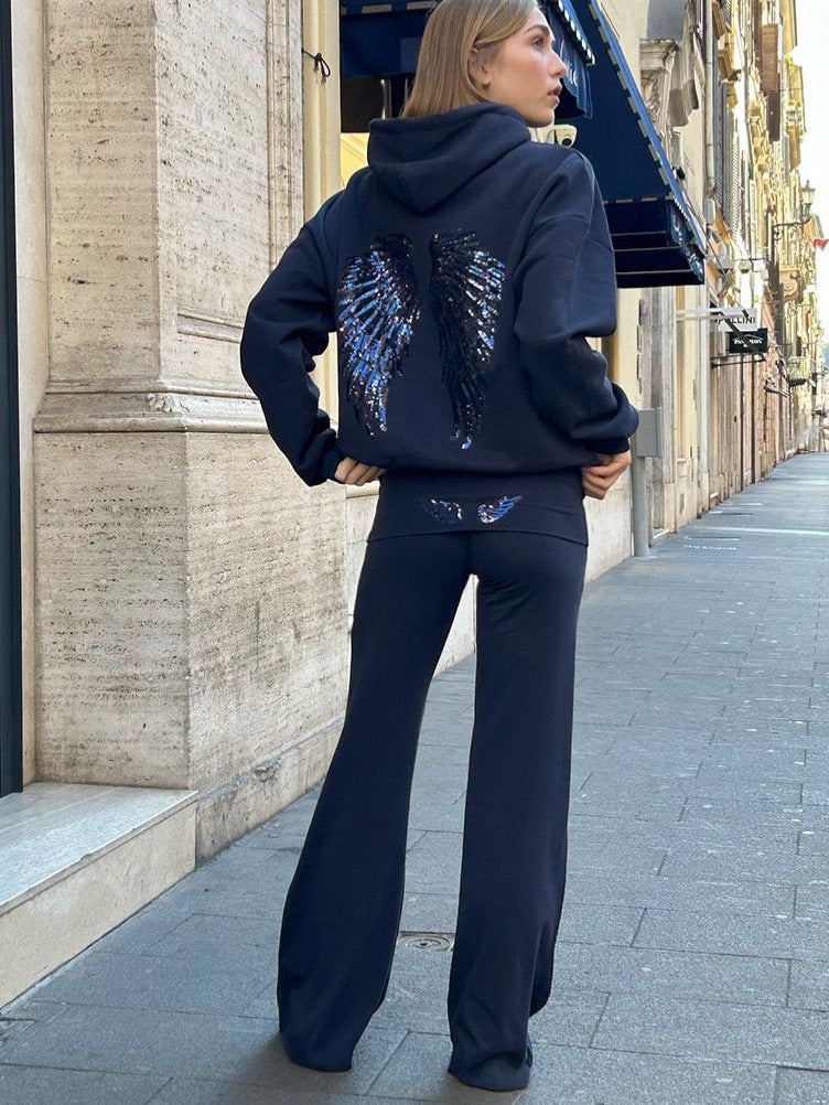 2025 Burst Fashion Personality Wing Squins Pattern Hooded Loose Sweater Straight Trousers Trousers Women