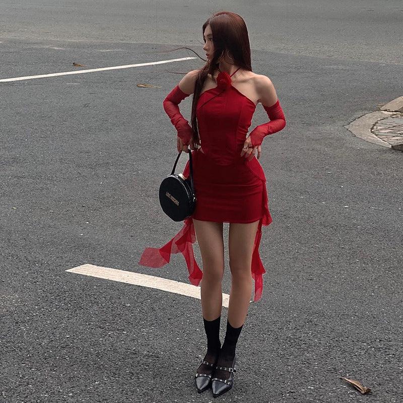 2025 Autumn And Winter New Women's Flowers Hanging Neck Sexy Bare Back Small Vest Temperament Mesh Bag Hip Skirt Suit Woman
