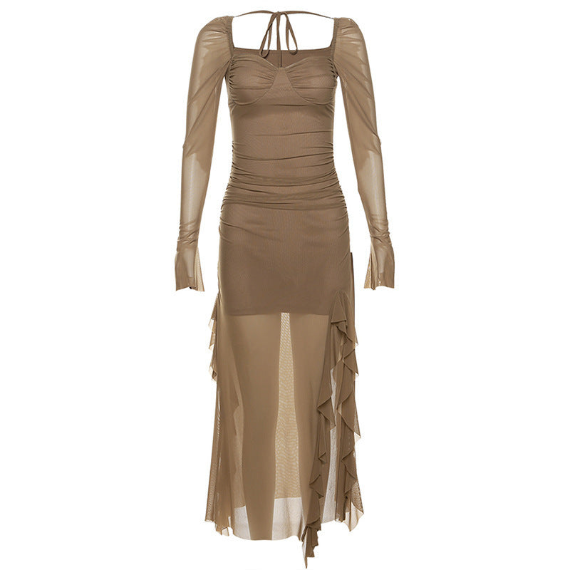 2025 Autumn And Winter New Women's Mesh Yarn Leaves Side Of The Niche Design Feeling Long-Sleeved Square Collar Dress