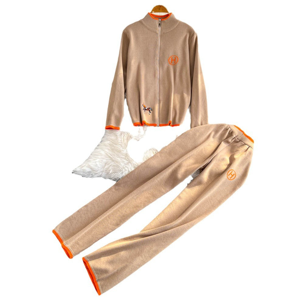 Autumn And Winter New Zipper Sweater Jacket Creative Pony Embroidered Long-Sleeved Knitted Trousers Two Sets Of Women