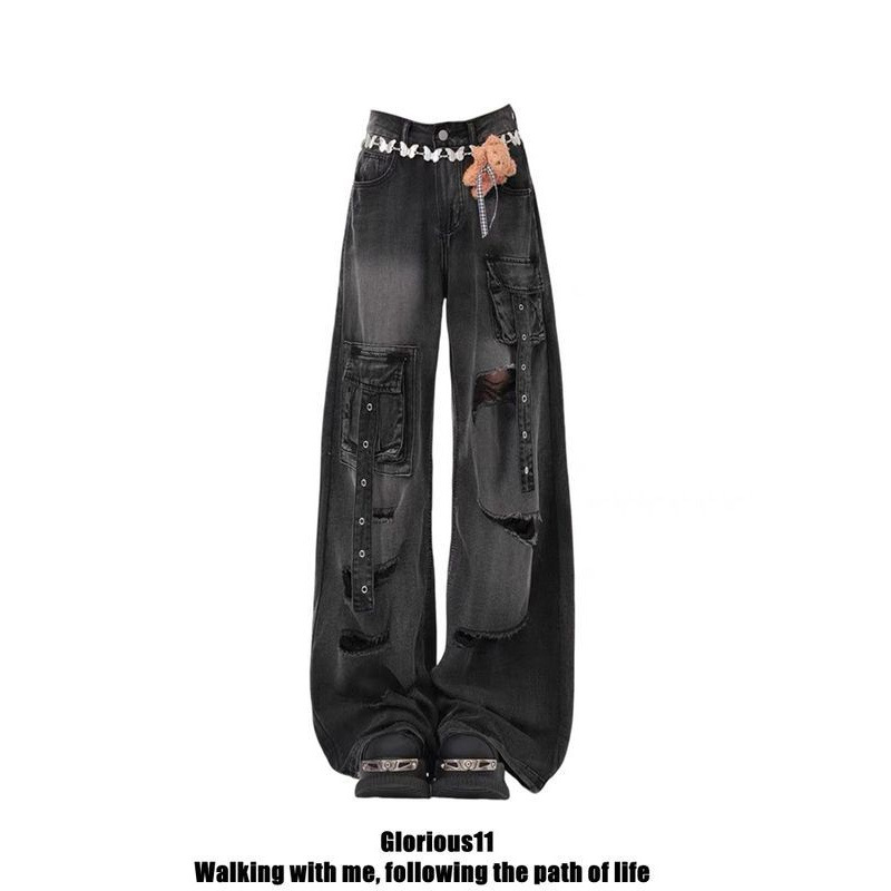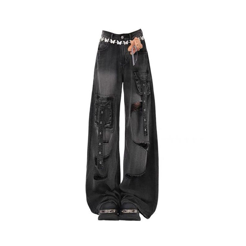Black Multi-Pocket-Hole-Wear Jeans Women's Summer 2025 New High-Waist Design Wide-Legged Pants