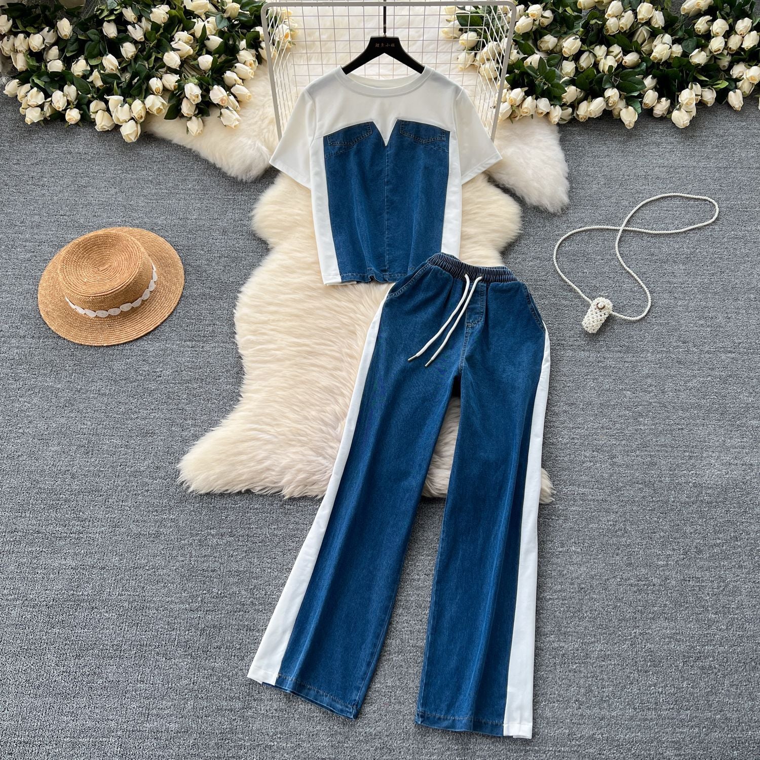 Chic Hong Kong-Flavored Suit Female Design Sense Short-Sleeved T-Shirt Spliced Denim Jacket + High-Waisted Casual Straight Pants Two-Sleeve