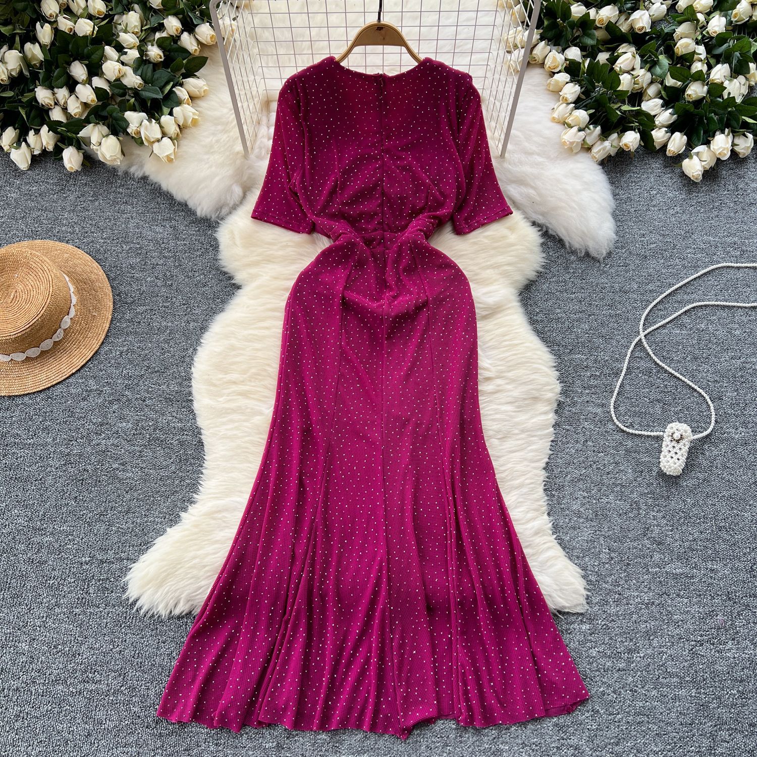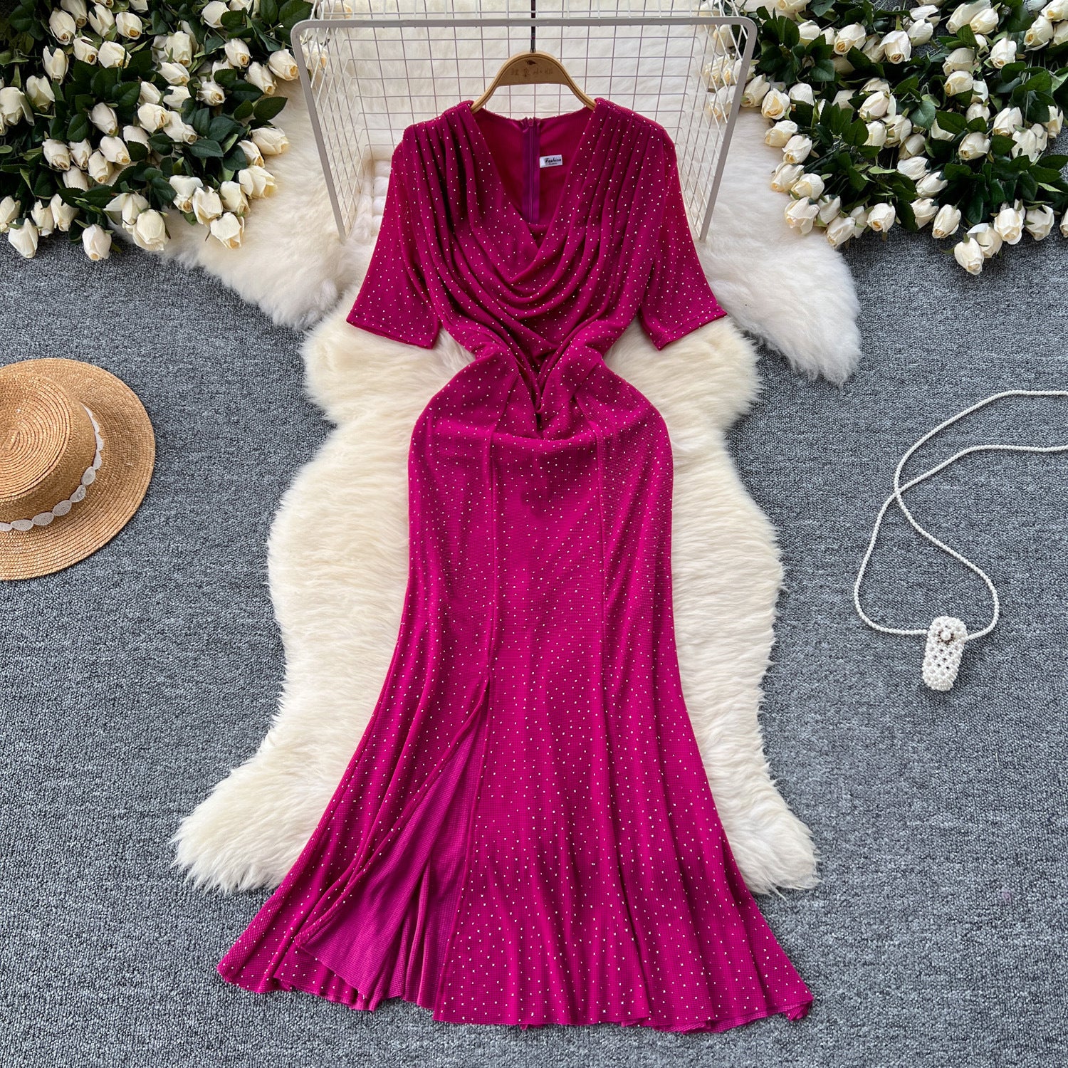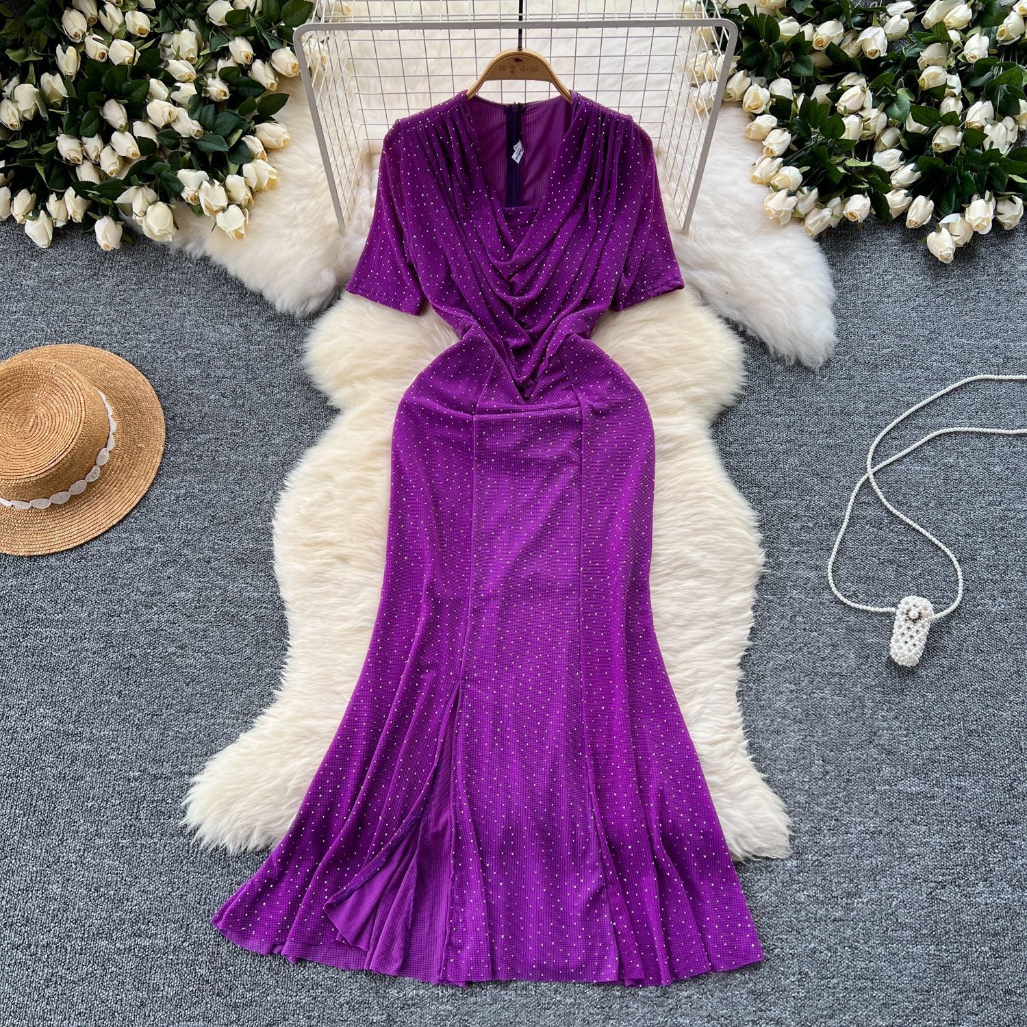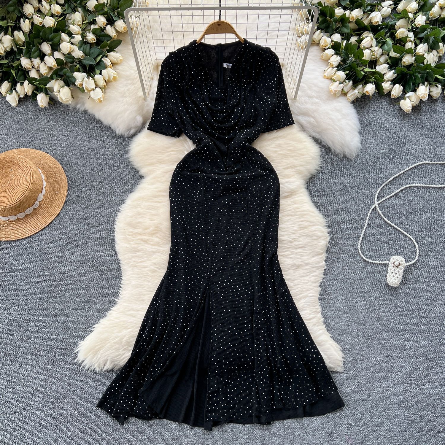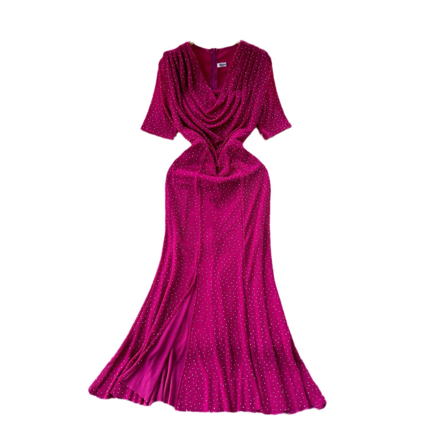 Cisterous Woman Sexy Collar Short Sleeve Dress Female High-End Royal Sister Repair Hot Diamond Open Fork Long Fishtail Dress