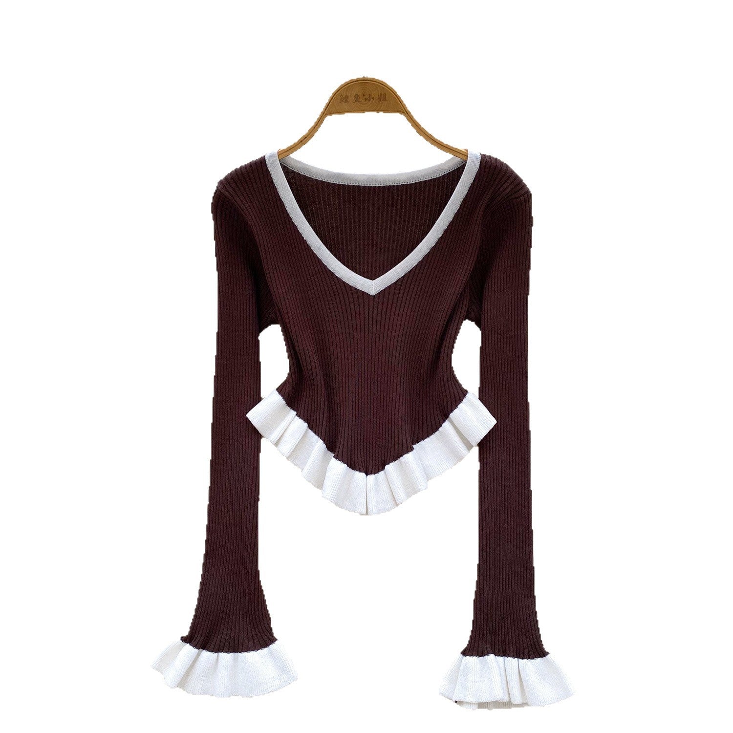 Clamming Striped Knitted Shirt Autumn Lotus Side Hem Horn Sleeves Slimmed Out Of The Bottom Coat