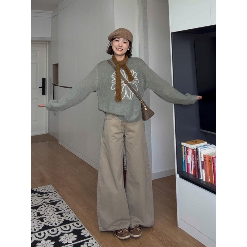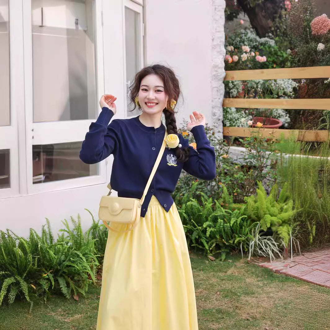 College Style Blue Embroidered Long-Sleeved Knitted Cardigan Women Early Spring Wool Sweater Short Thin Inside Cloth