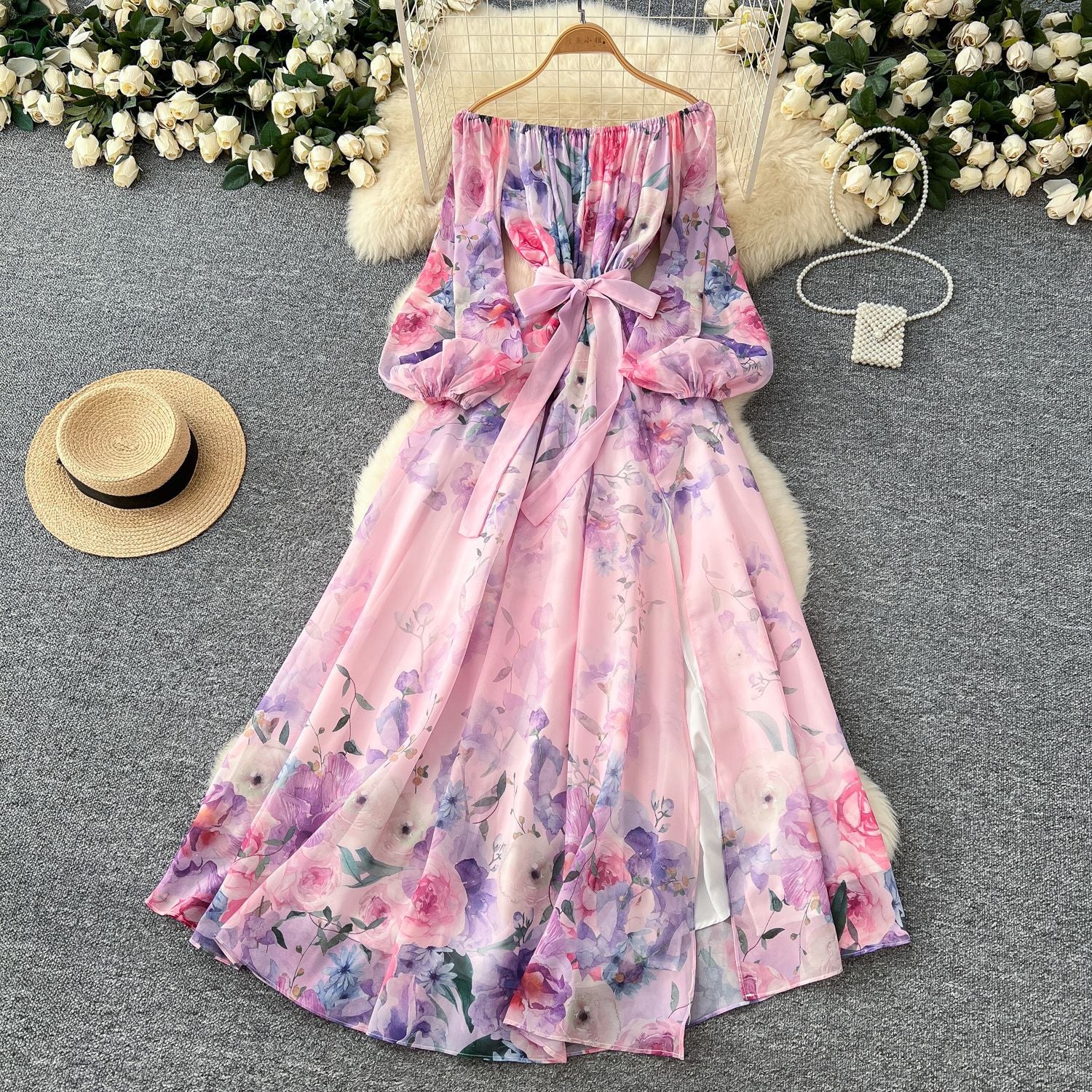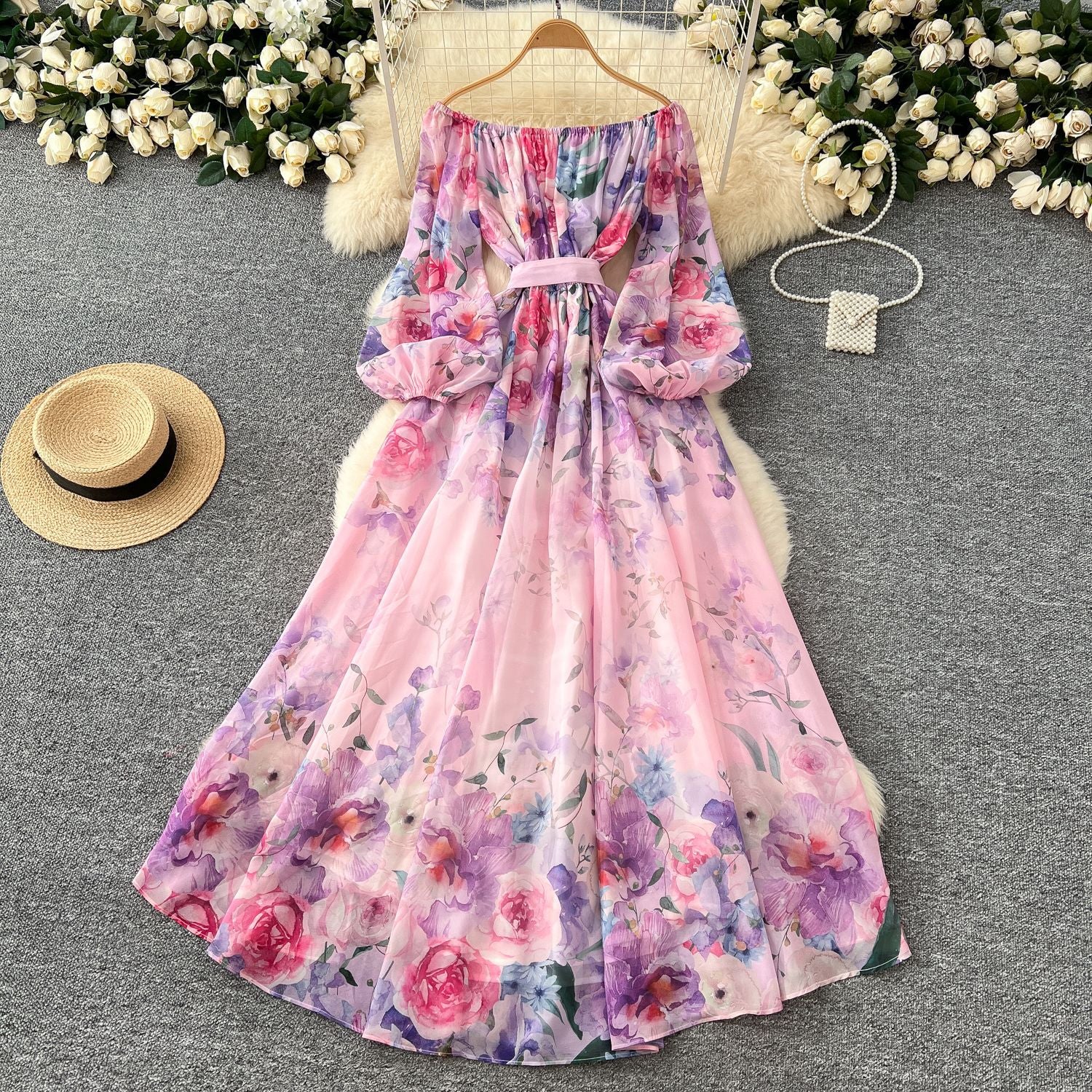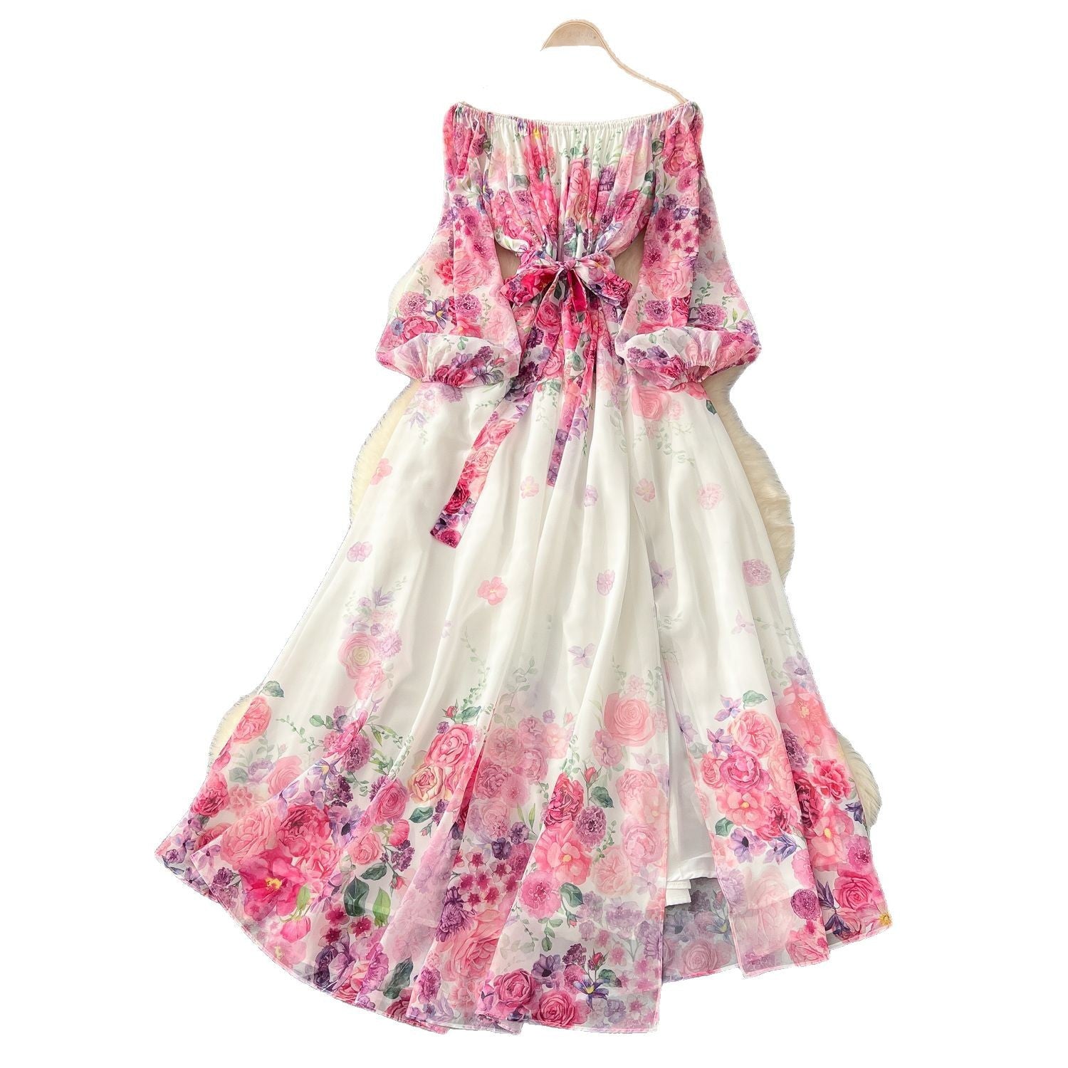 Early Spring Holiday Style Dress Woman 2025 New Shoulder Strapped Belt Waist Lantern Sleeve Print Chiffon Long Skirt