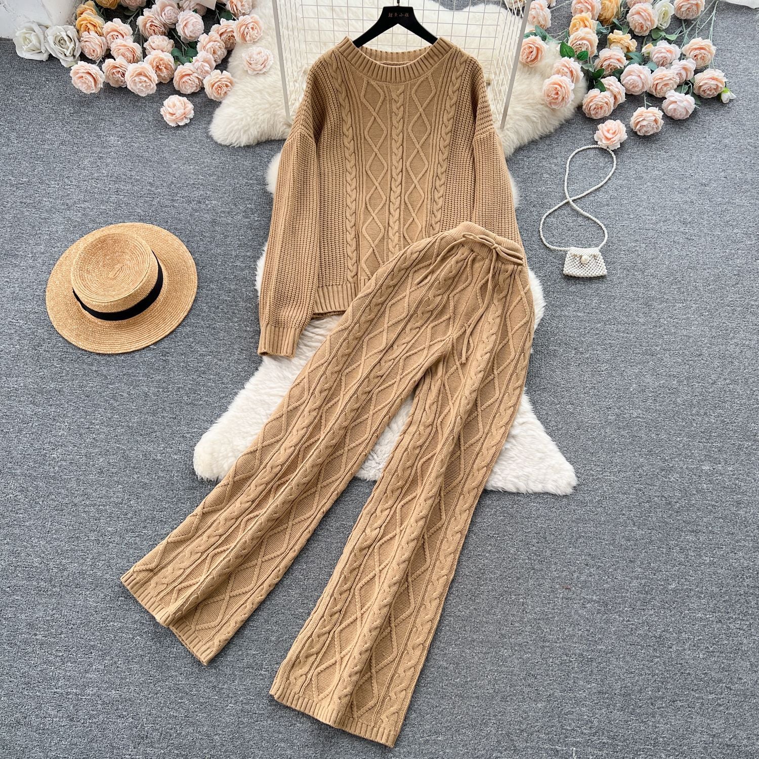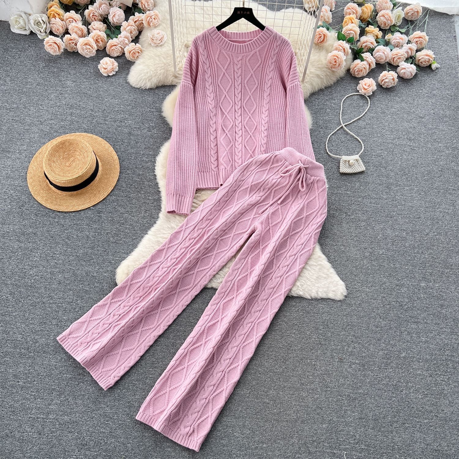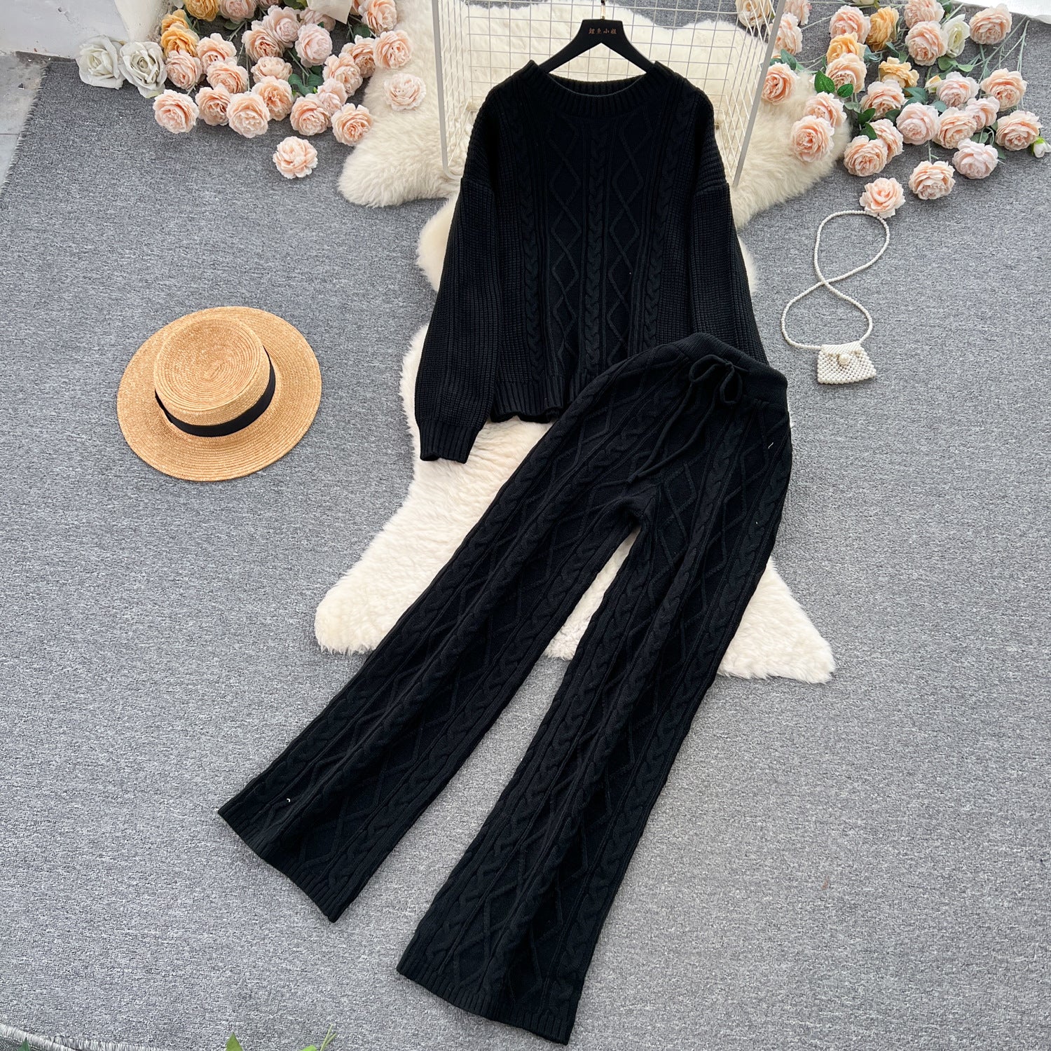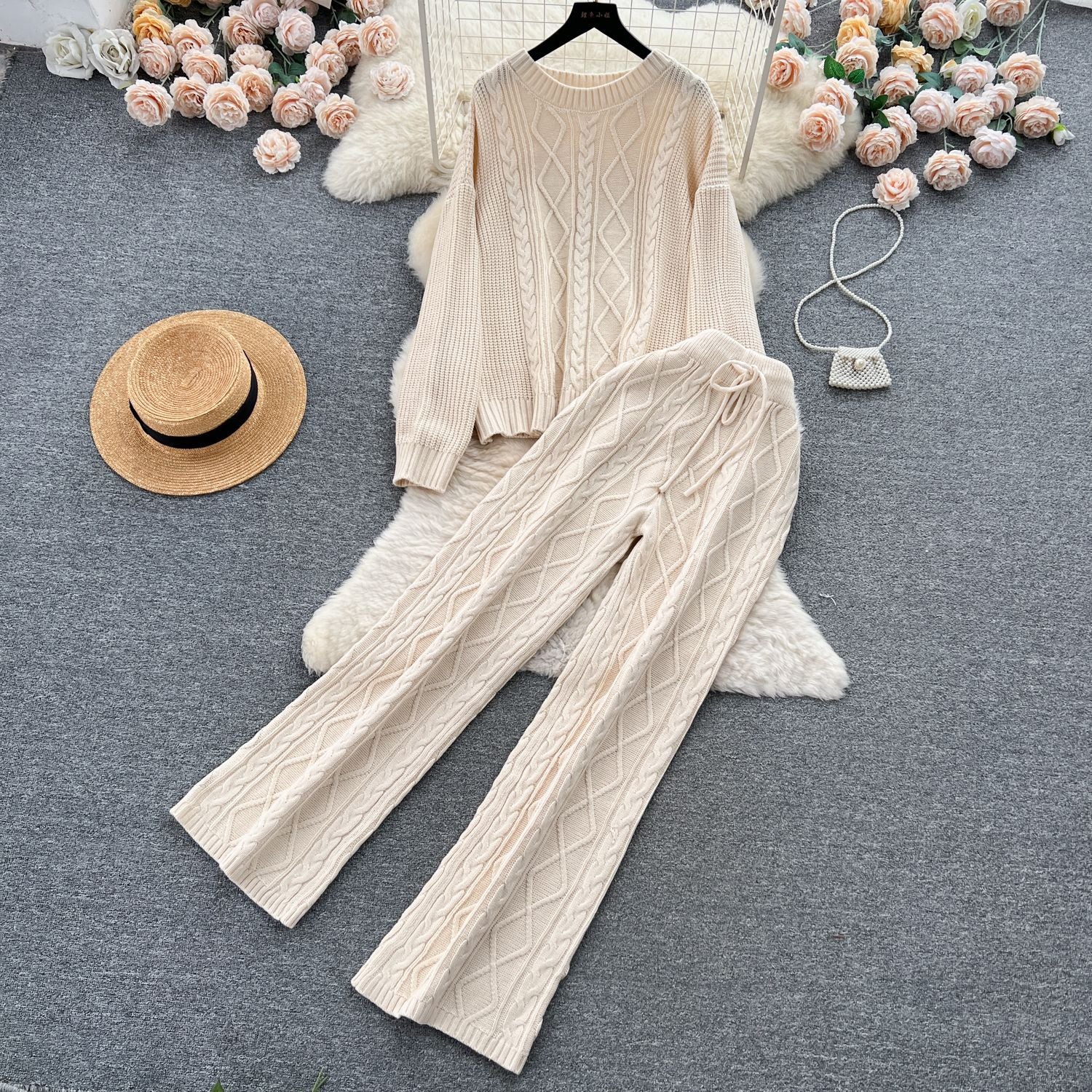 Fashion Suit Female French Gentle Wind Loose Jersey Sweater High Waist Thin Trousers Two-Set