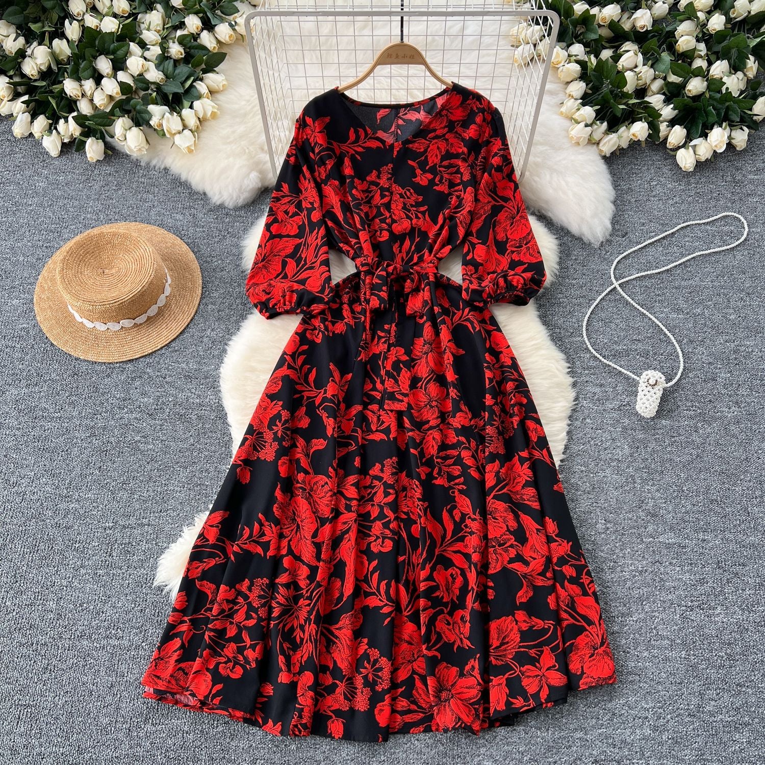 2025 Summer Dress New Niche Light Familiar Wind V To Receive Waist Thin Temperament French Pressure Folding Printing Chiffon Dress