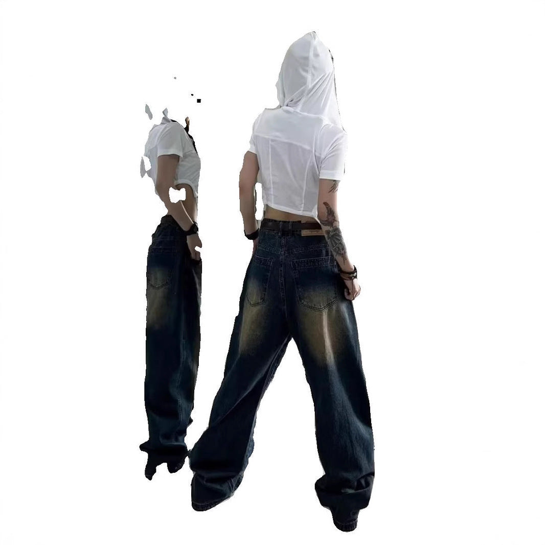 High Street Vintage Blue Straight Jeans Men And Women Loose-Hanging Feel To Do Old Fashion Broad-Legged Drag Pants Tide
