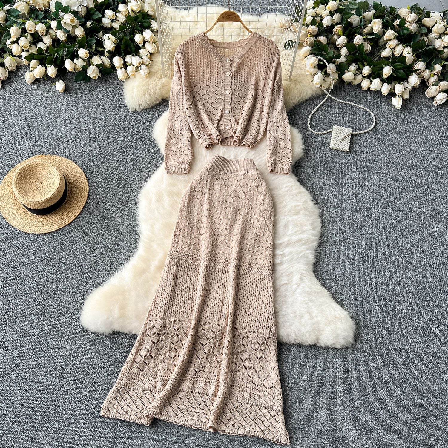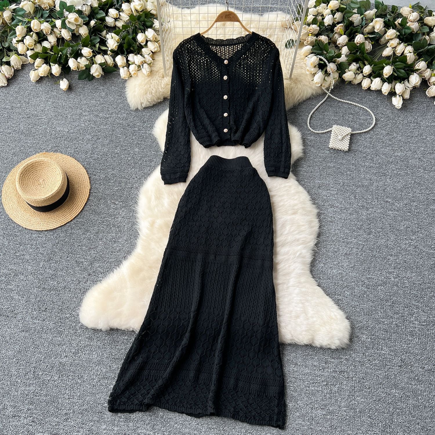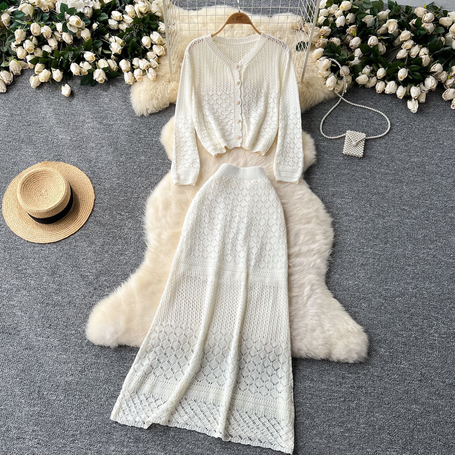 Small-Scale Vintage Hollow Crocheted Shoulder Sling Knitted Shirt Two Sets Of Women's Half-Dress