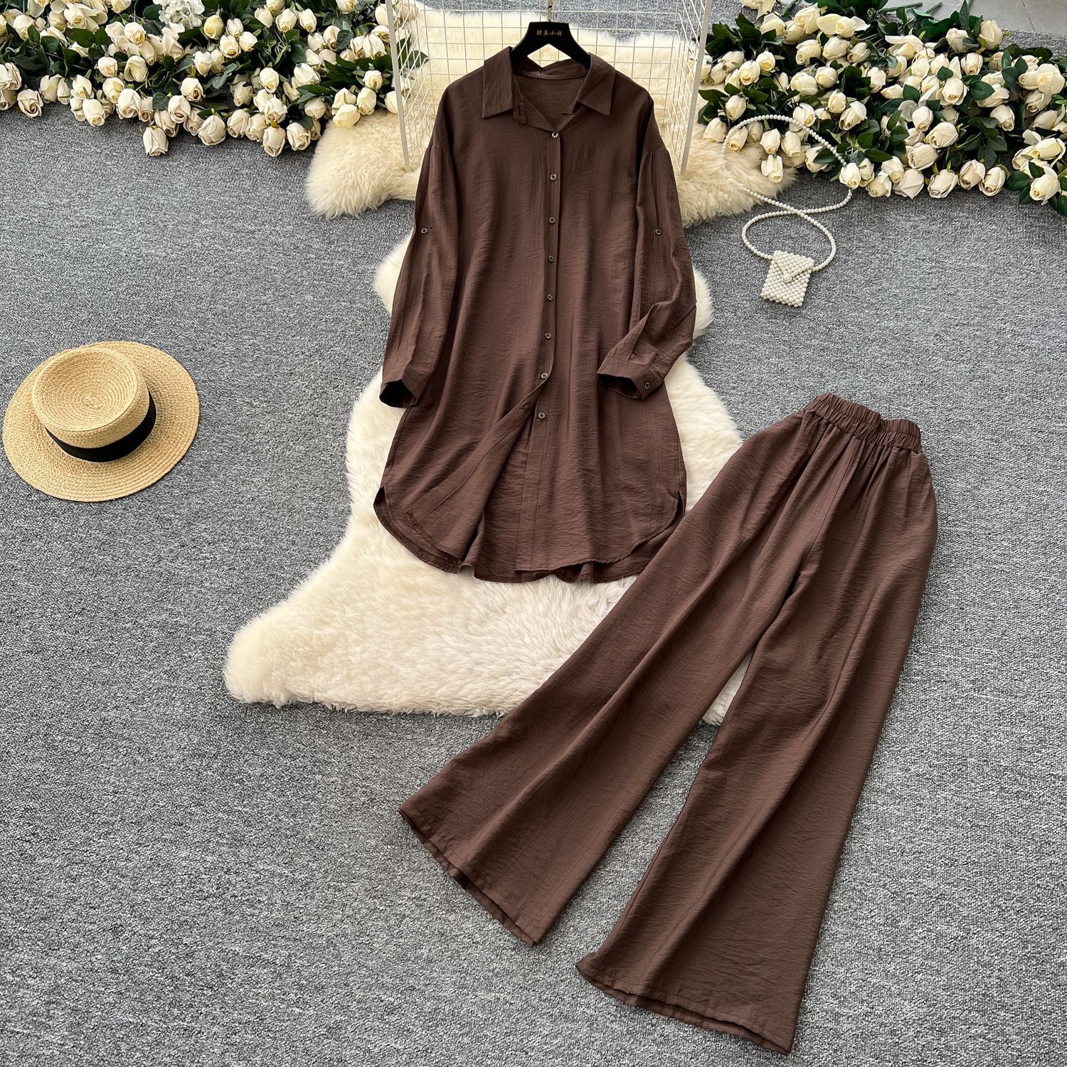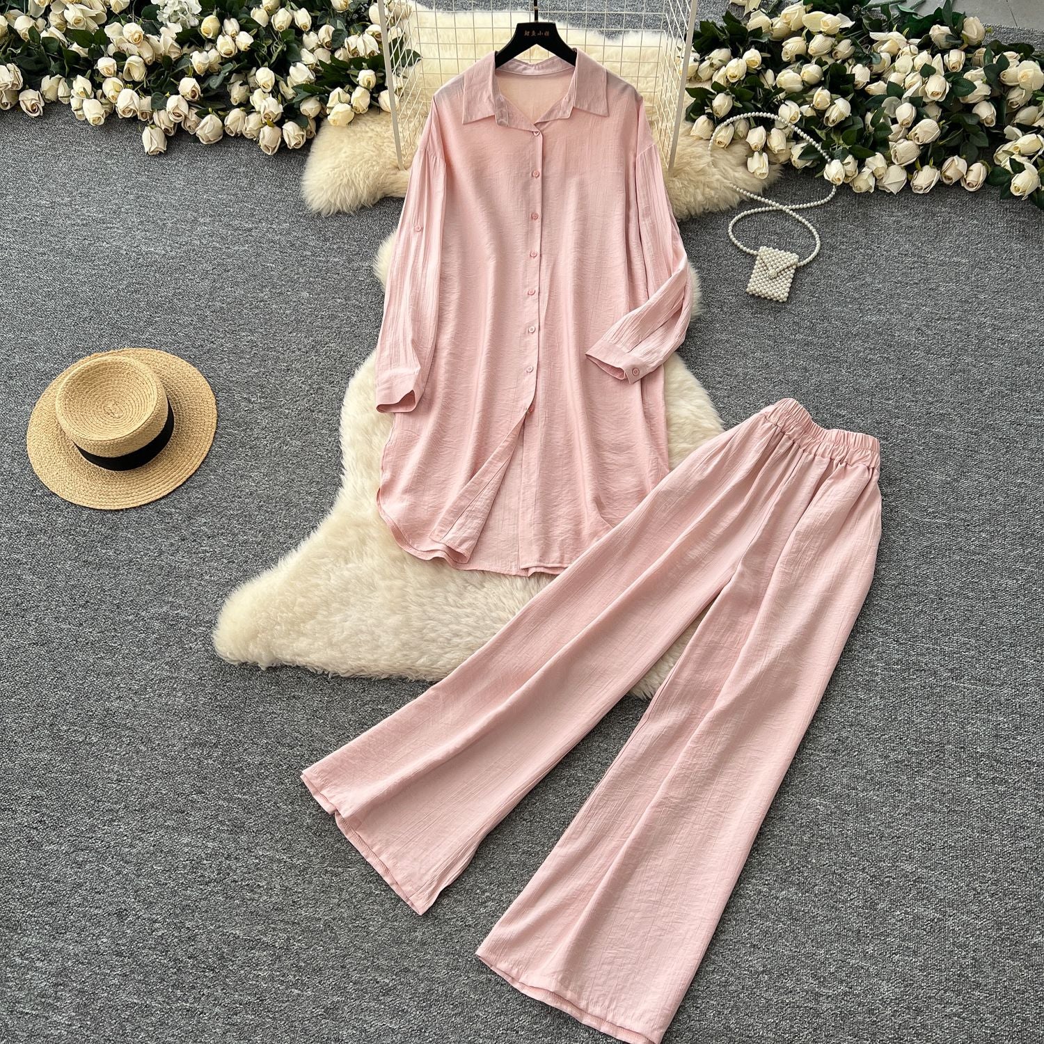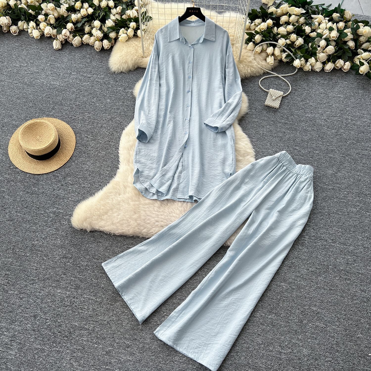 Lazy Casual Suit Women's Korean Version Of The Fashion Loose Long-Sleeved Shirt Dress High Waist Wide Leg Pants