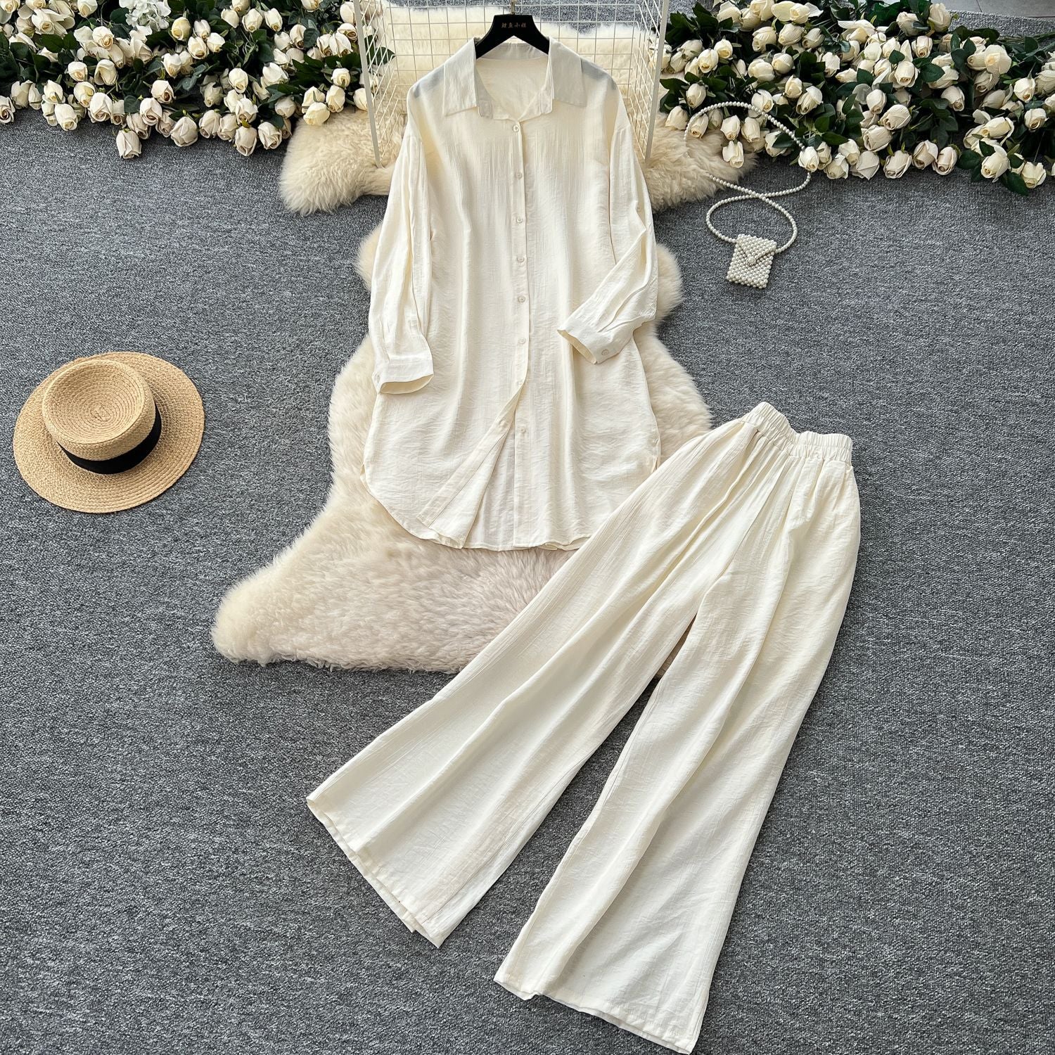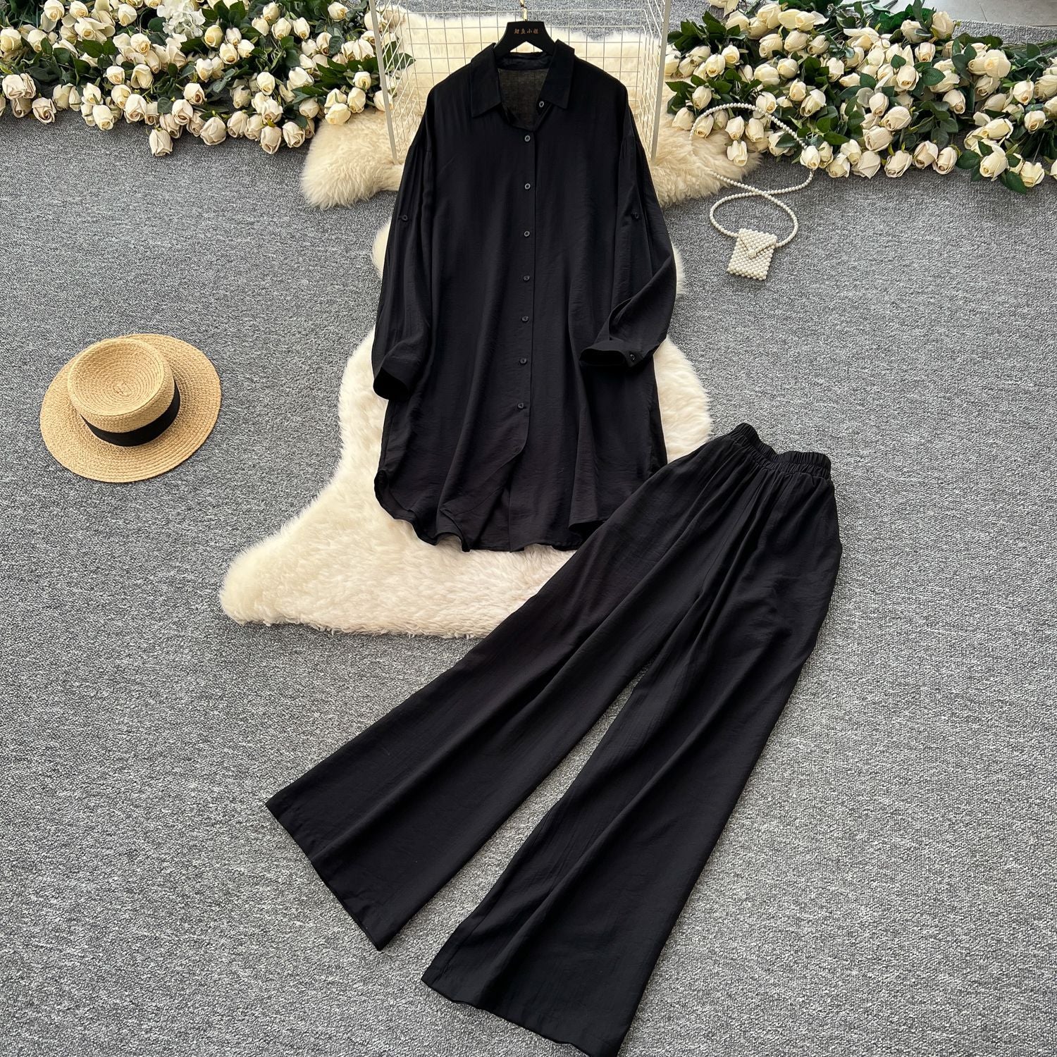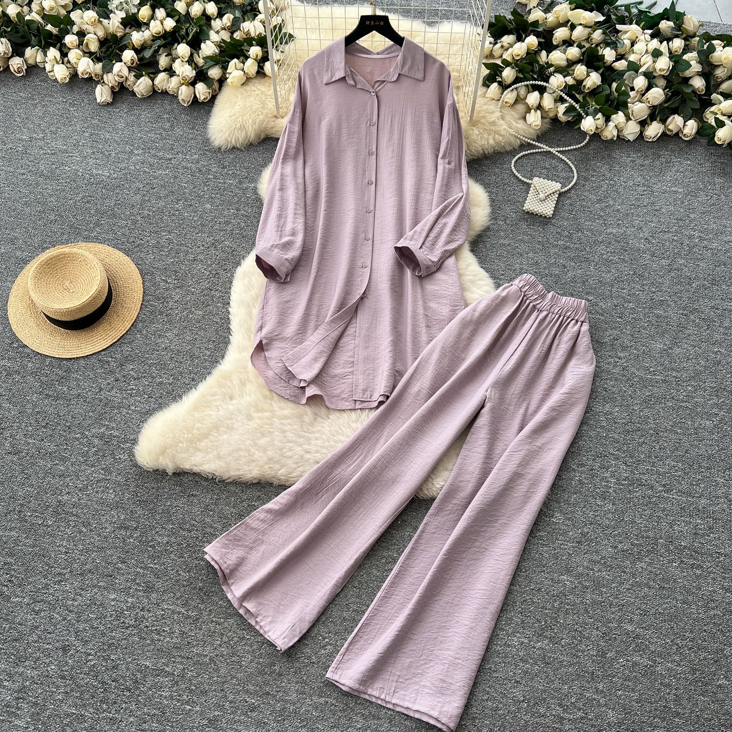 Lazy Casual Suit Women's Korean Version Of The Fashion Loose Long-Sleeved Shirt Dress High Waist Wide Leg Pants