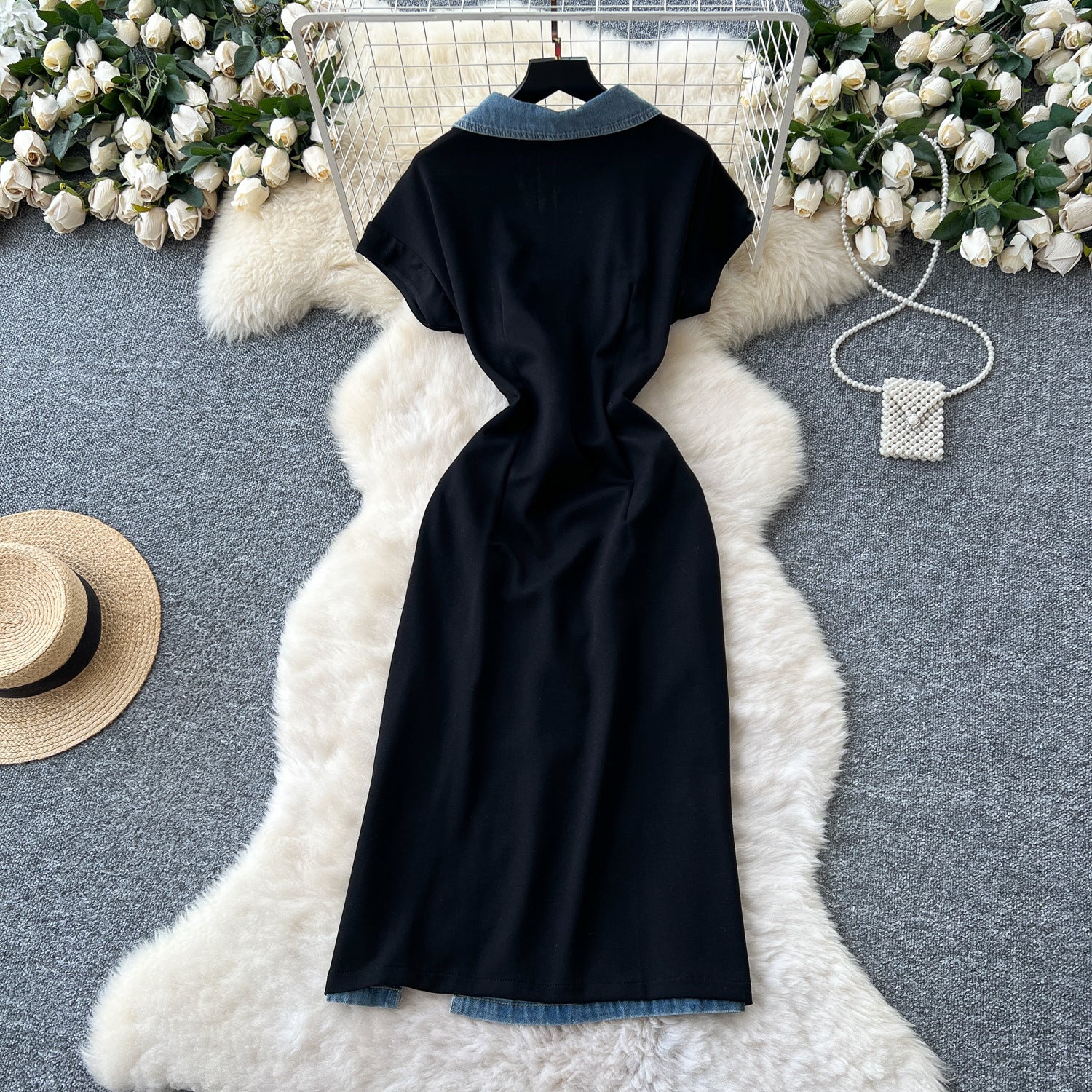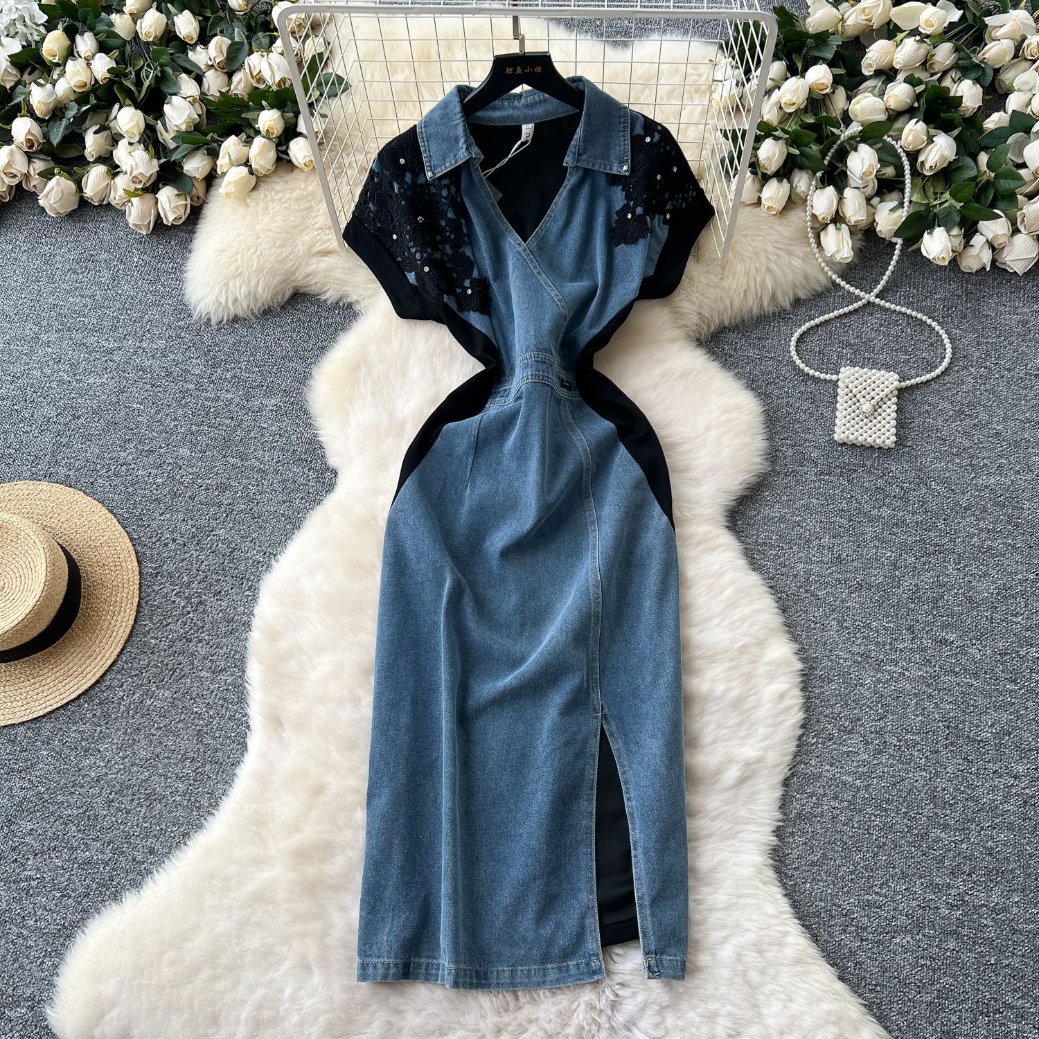 Light-Cooked Fashion Niche Fashion Heavyweight Diamond Lace Splicing Polo Collar Short Sleeves Denim Waist Dress Women's Summer Dress
