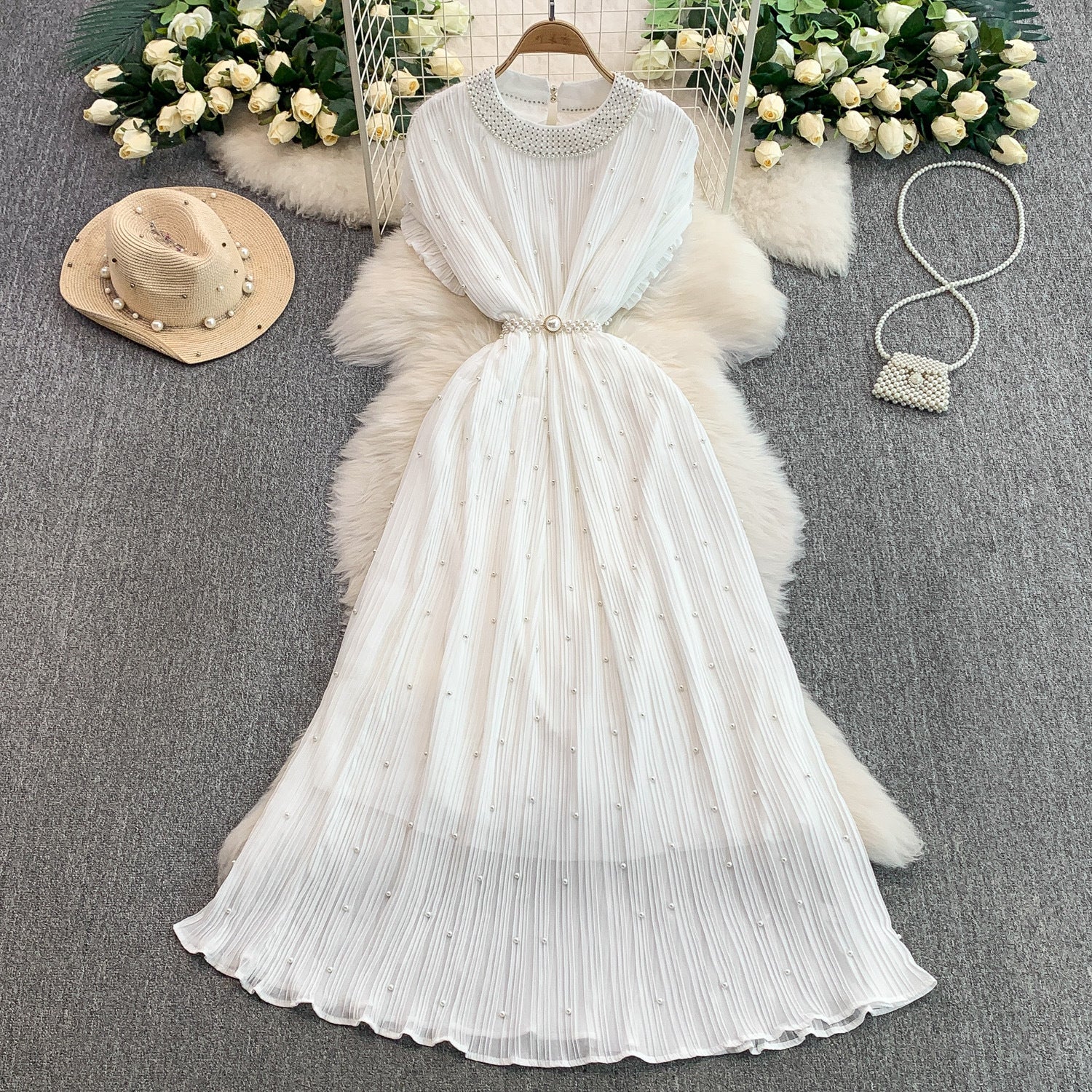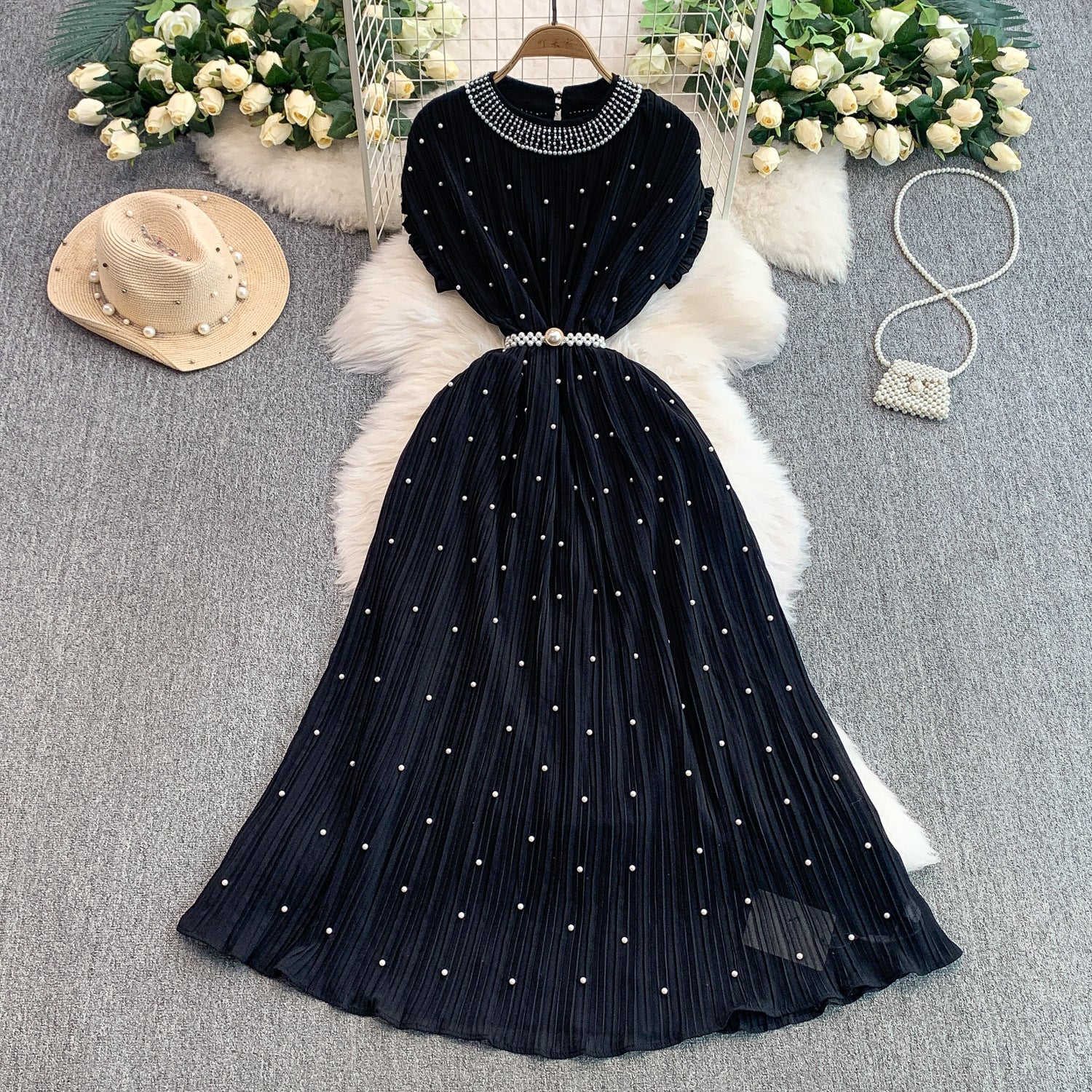 Light Luxury Famous Heavy Industry Nail Ball Collar Dress Women Summer Waist Thin 100 Fold Elegant Dress Dress Dress