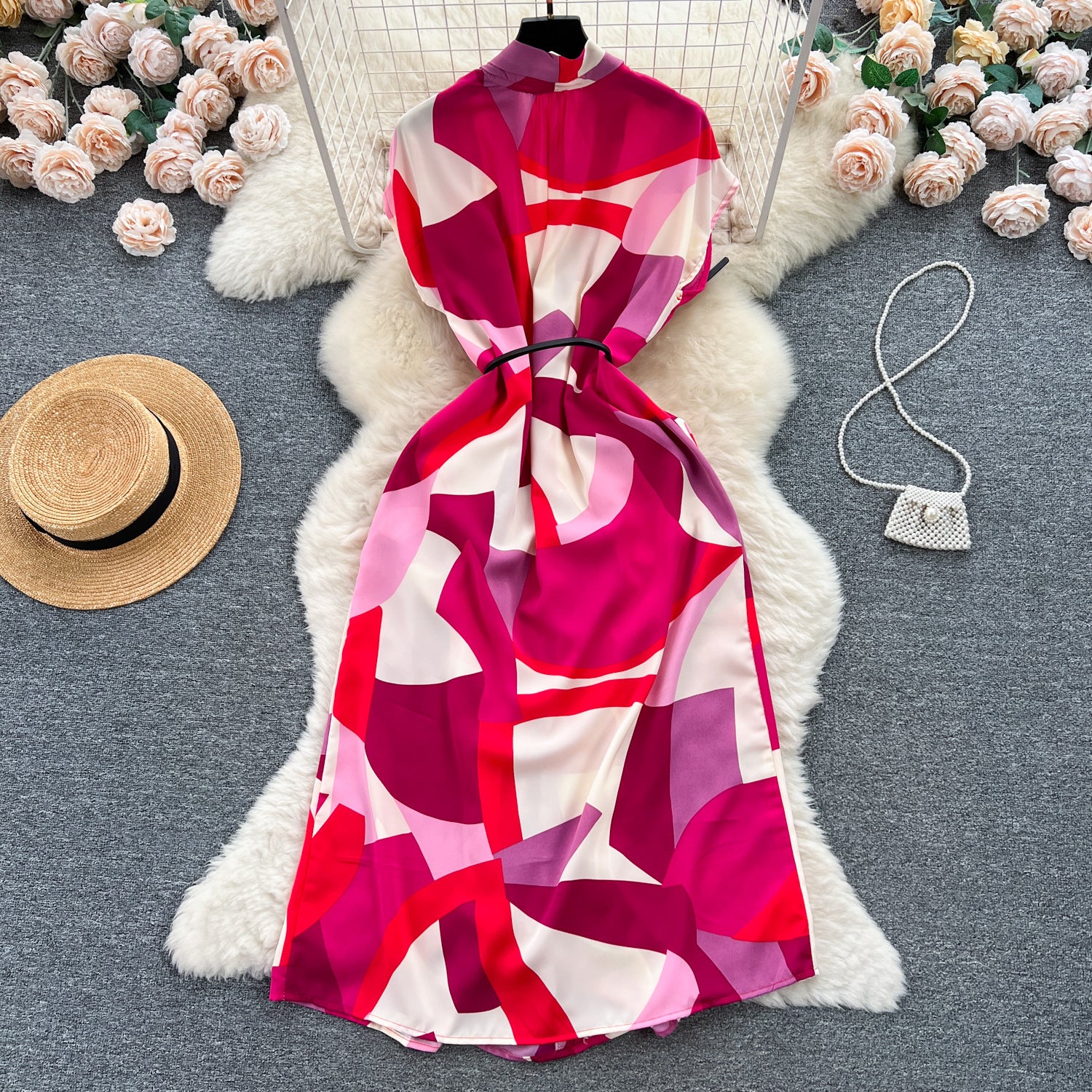 Light Luxury Retro V-Neck Print Dress Women's Summer French Tamped Loose Thin Long Shirt Skirt