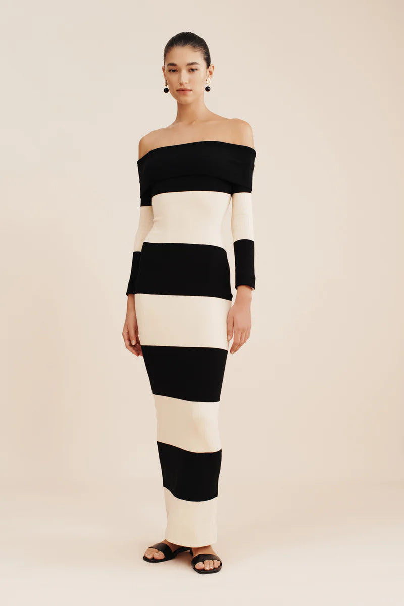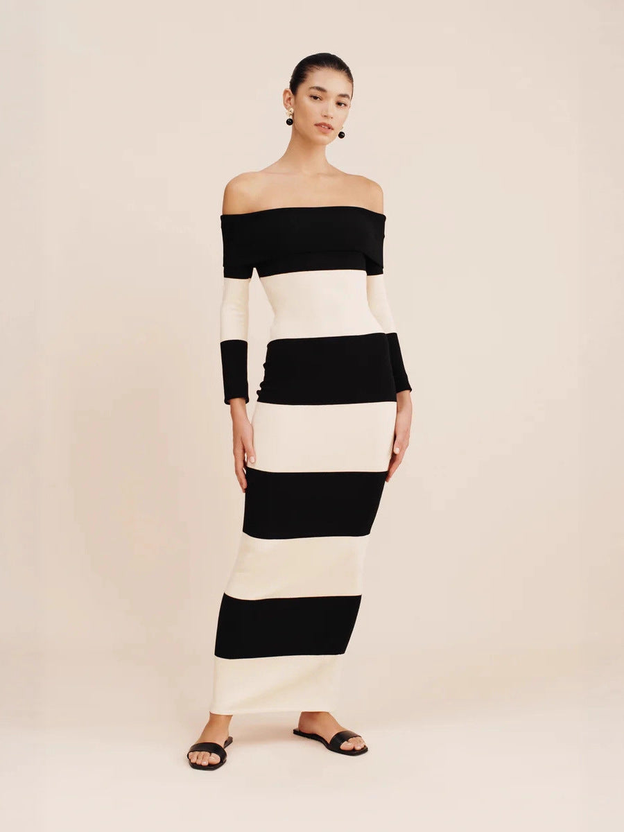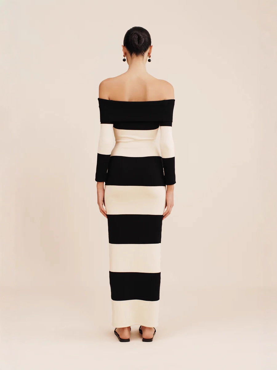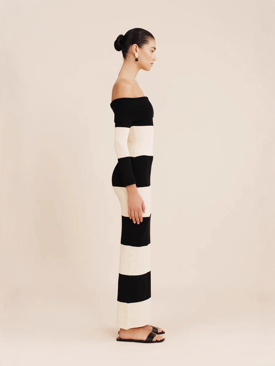 New Women's Fashion Elegant Shoulder-To-Shoulder Knitted Blouse Striped Shoulder-Long Dress