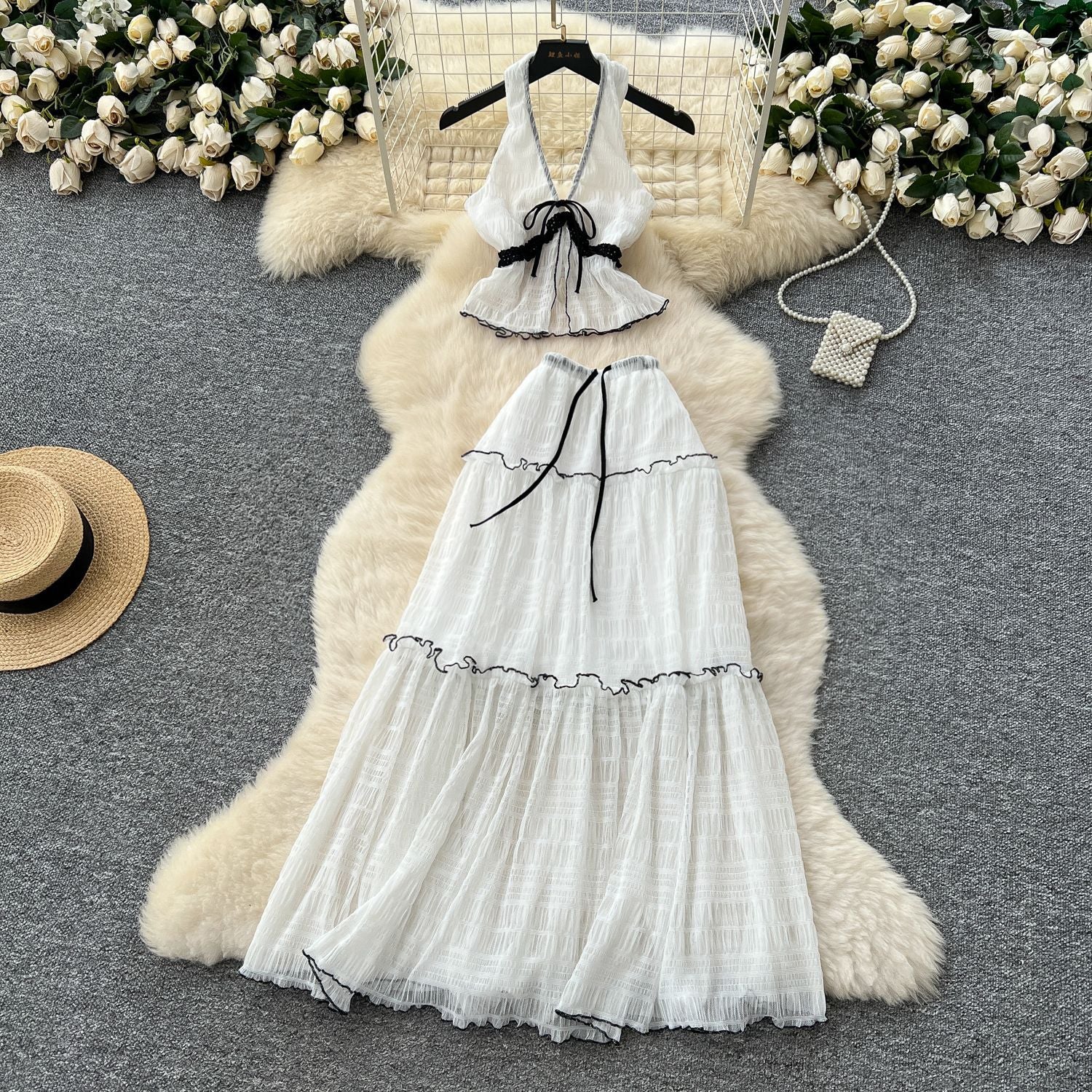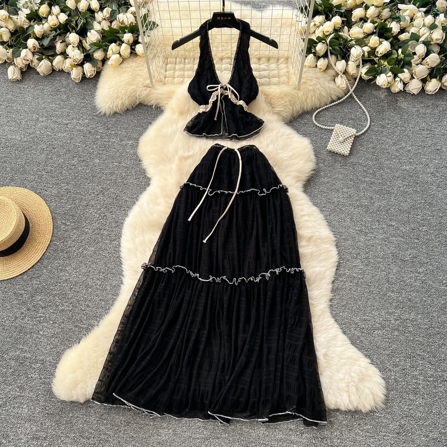 Pure-Want Holiday Suit Female Summer Sexy Hanging Neck V Neck Bare Back Chiffon Top High Waist Half Skirt Suit