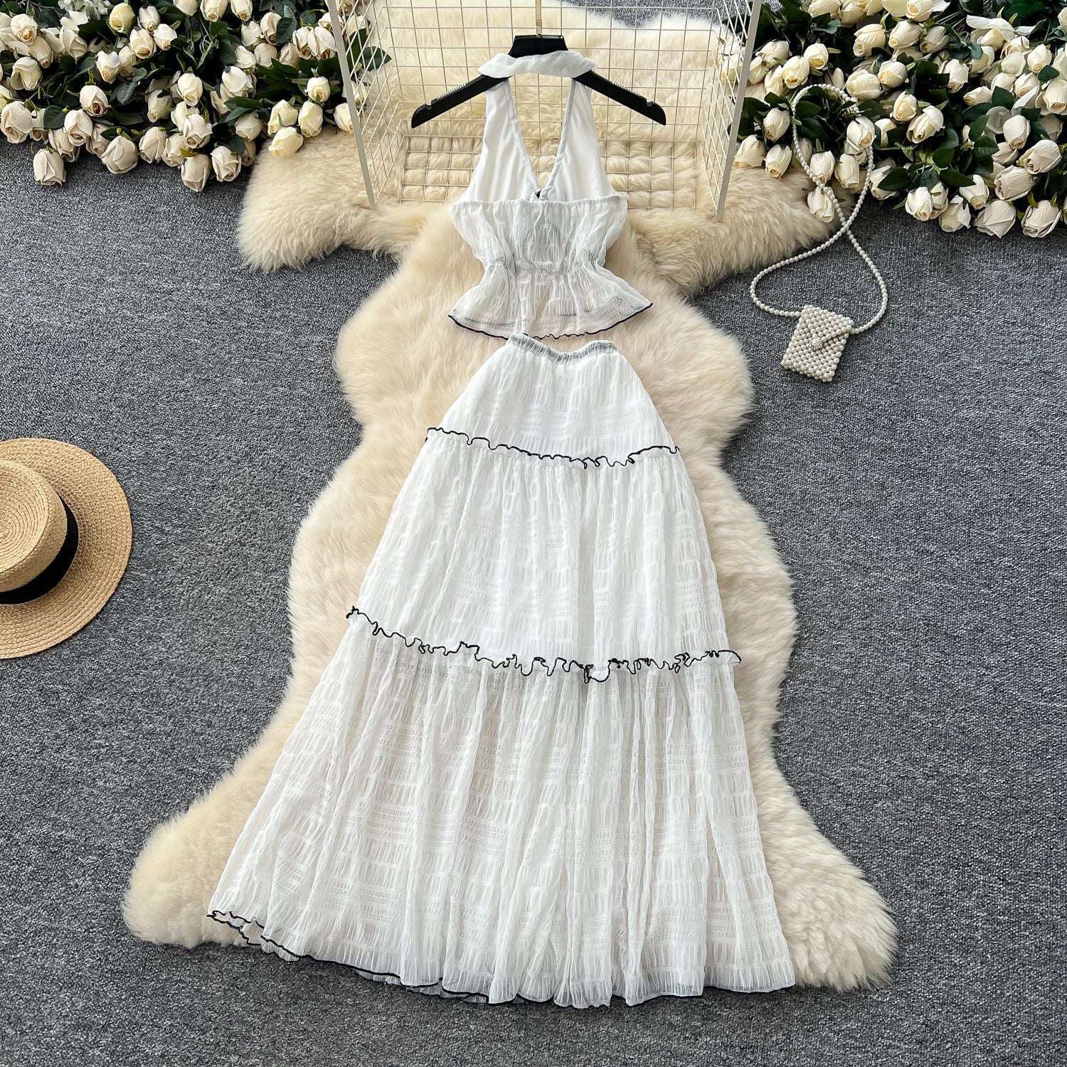 Small-Scale Vintage Hollow Crocheted Shoulder Sling Knitted Shirt Two Sets Of Women's Half-Dress