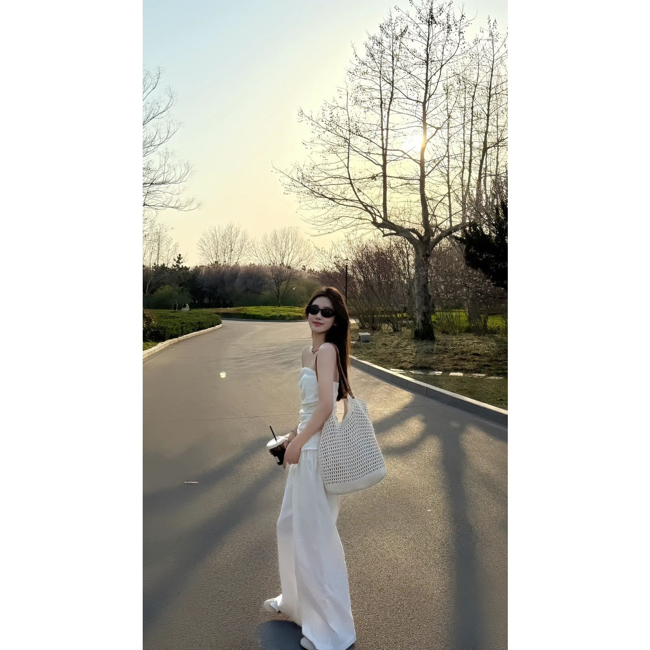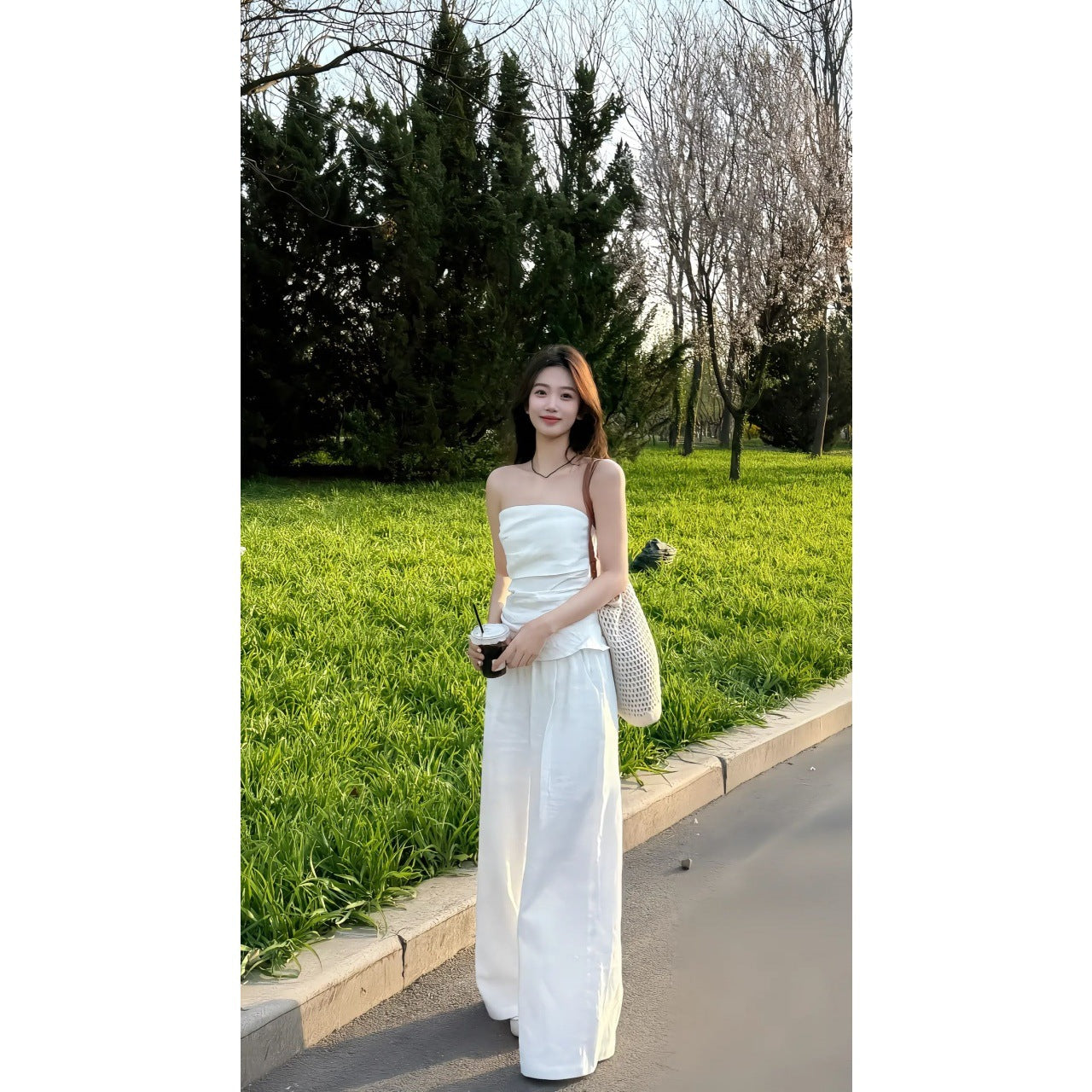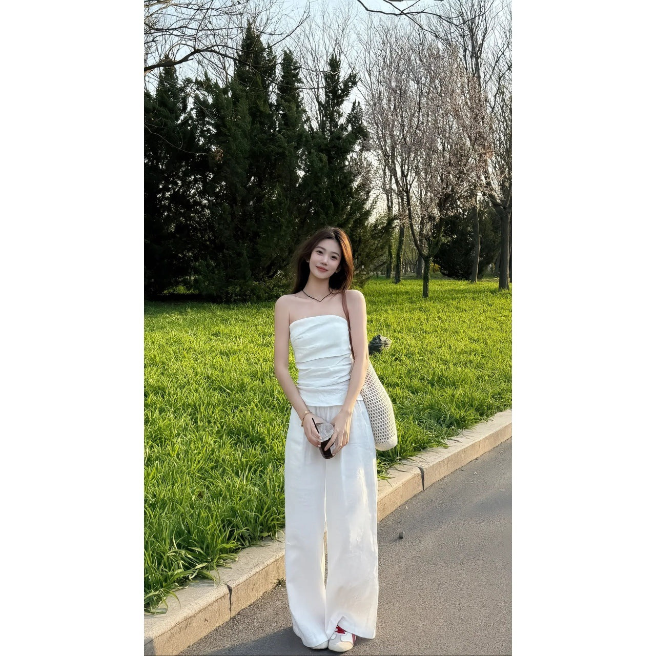 Simple Slim Slimming Blouse Set Of High-Waisted Loose Tug Trousers Casual Broad Leggings