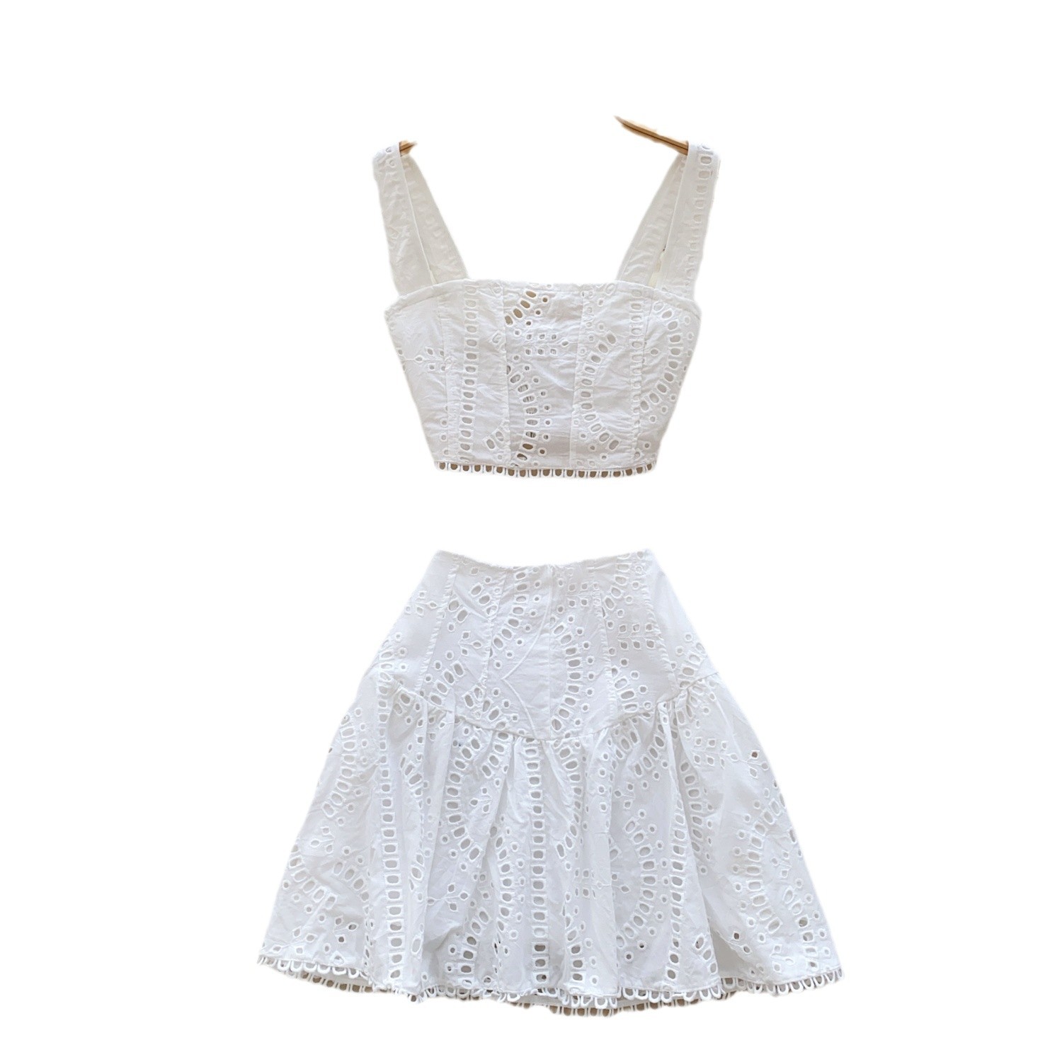 Spice Girls Hollow Embroidery Suit Female Sling With Short Waist Vest + High-Waist A-Word Skirt Sexy Two
