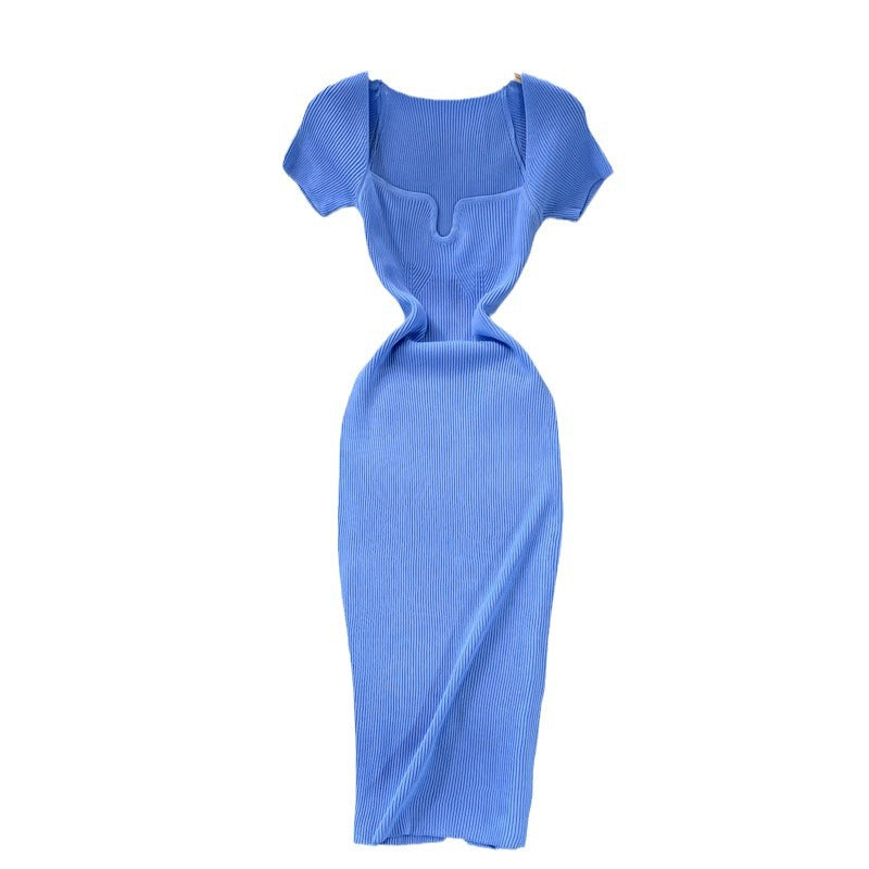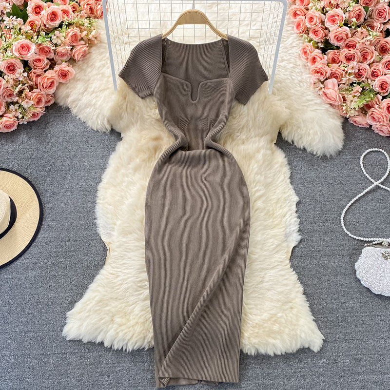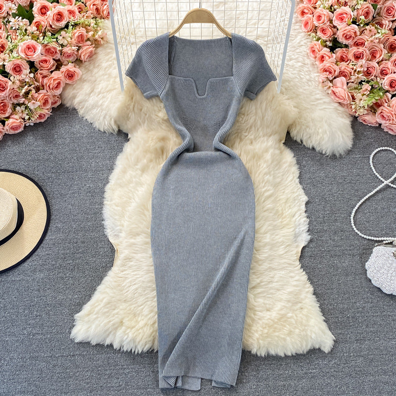 Tight-Up Thin Collar Knitted Dress Short Sleeve 2025 Summer New Temperament Sexy Hot Ass Long Skirt