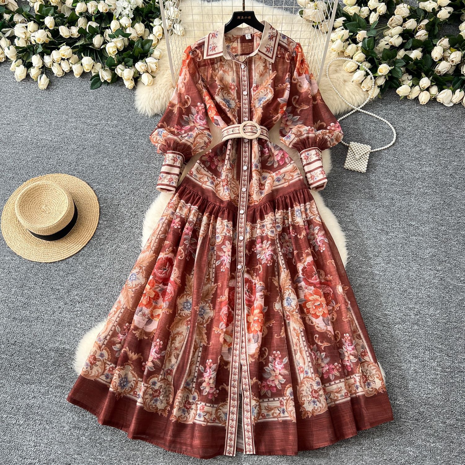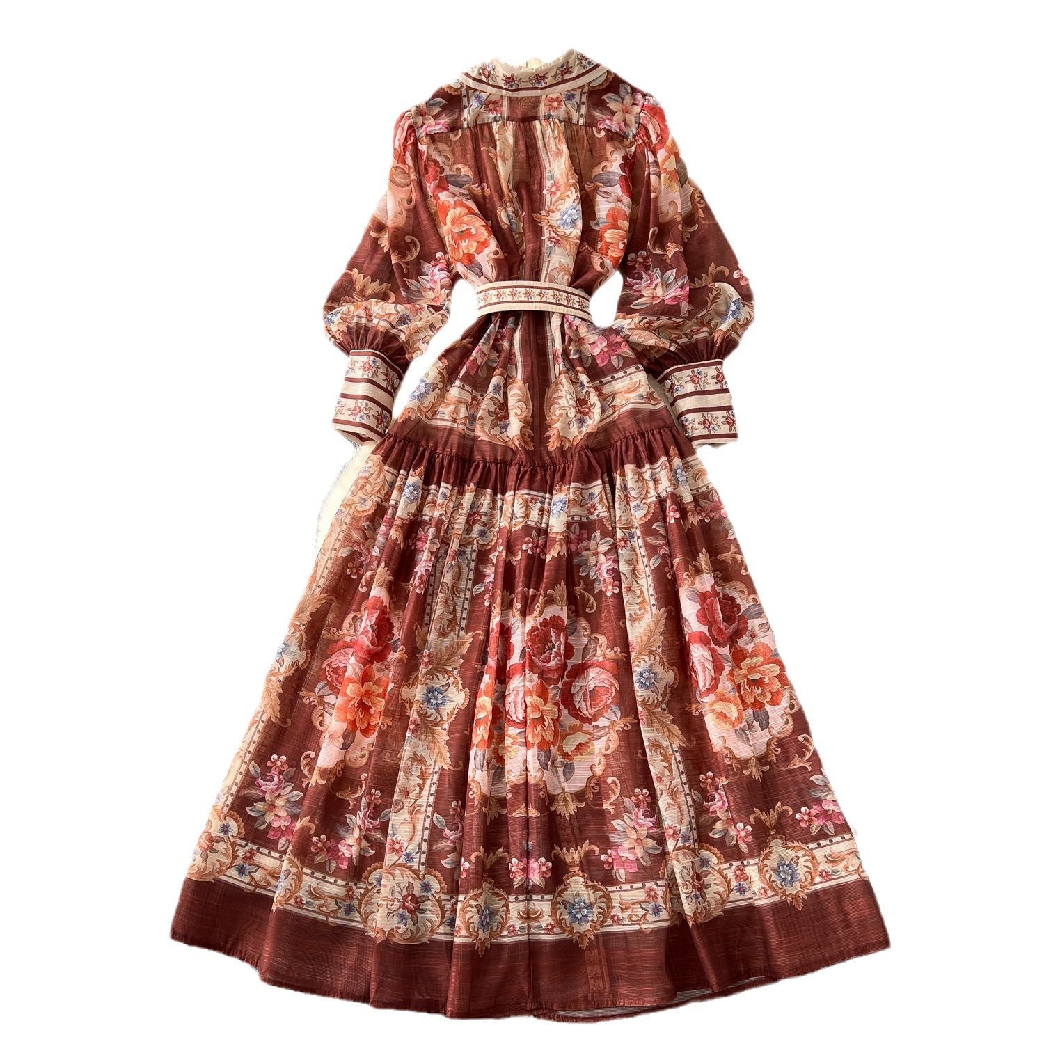 Vintage Court Print Flip Lantern Sleeves To Close Waist Single Buckle Dress Women Thin Elegant Long Dress