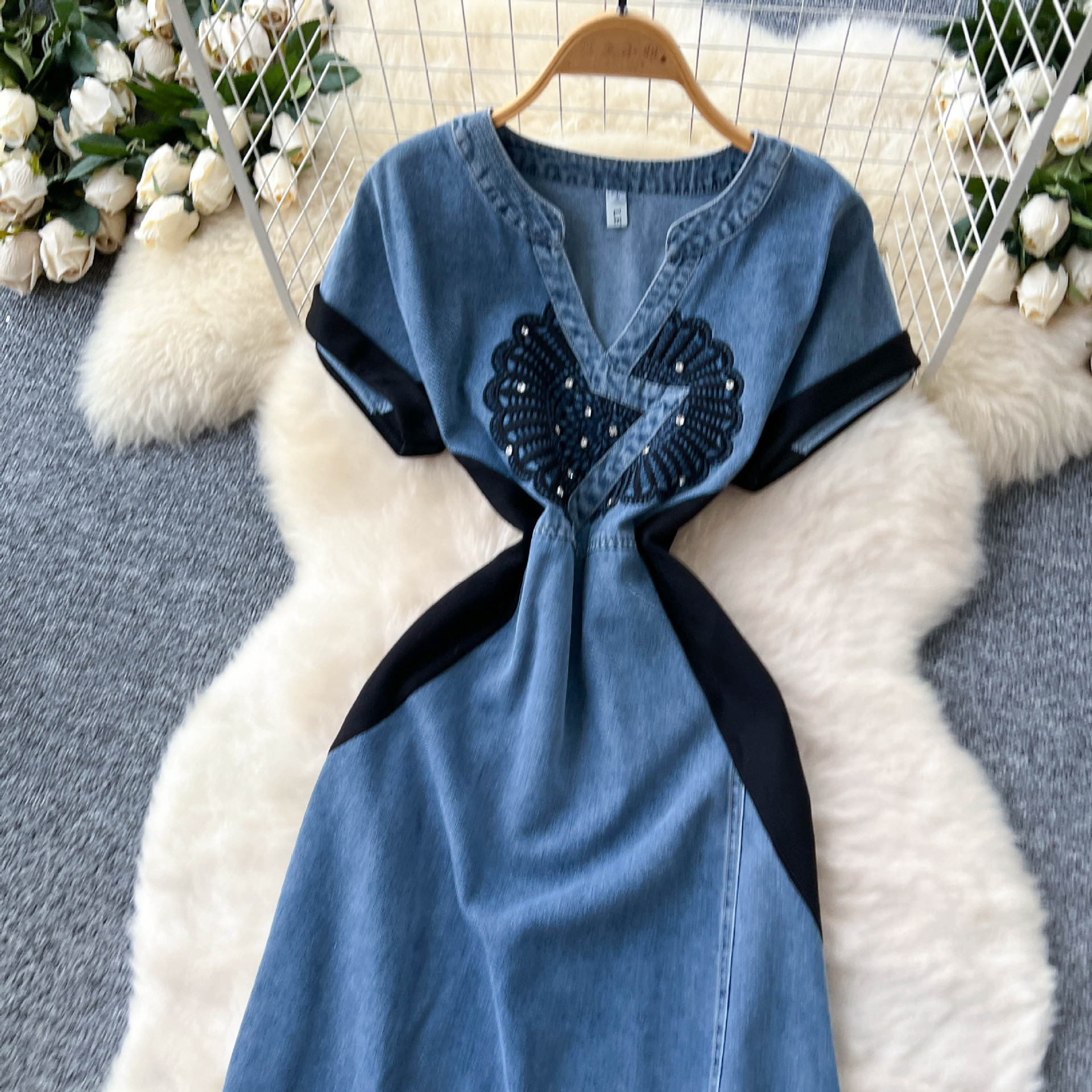 Vintage Elegant Denim Dress Woman 2025 Summer High-End Heavy Industry Diamond Embroidery Waist V-Neck Short-Sleeved Long Dress