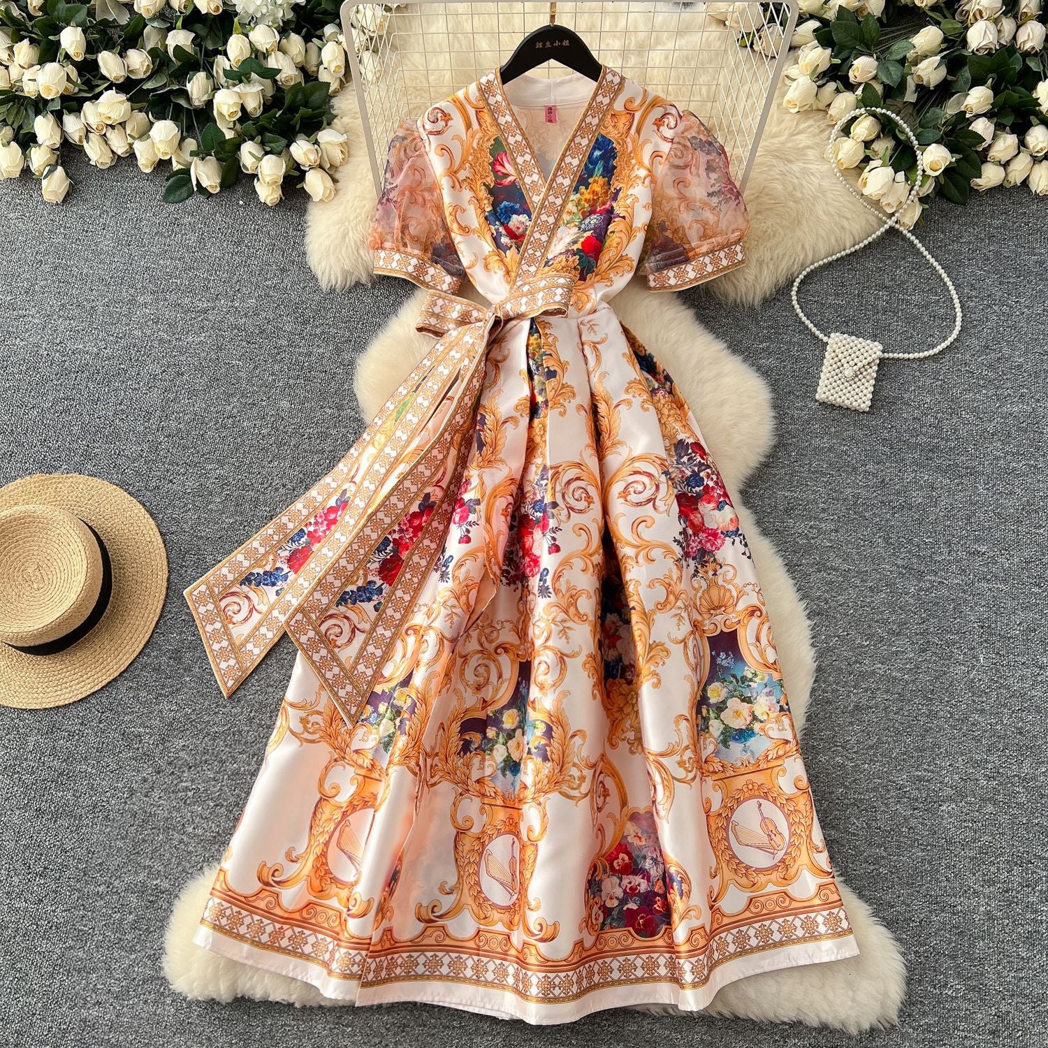 Wearing A Women's Court Style V Tie With A Belt Net Yarn Bubble Sleeve Print Large Swing Long Joint Dress