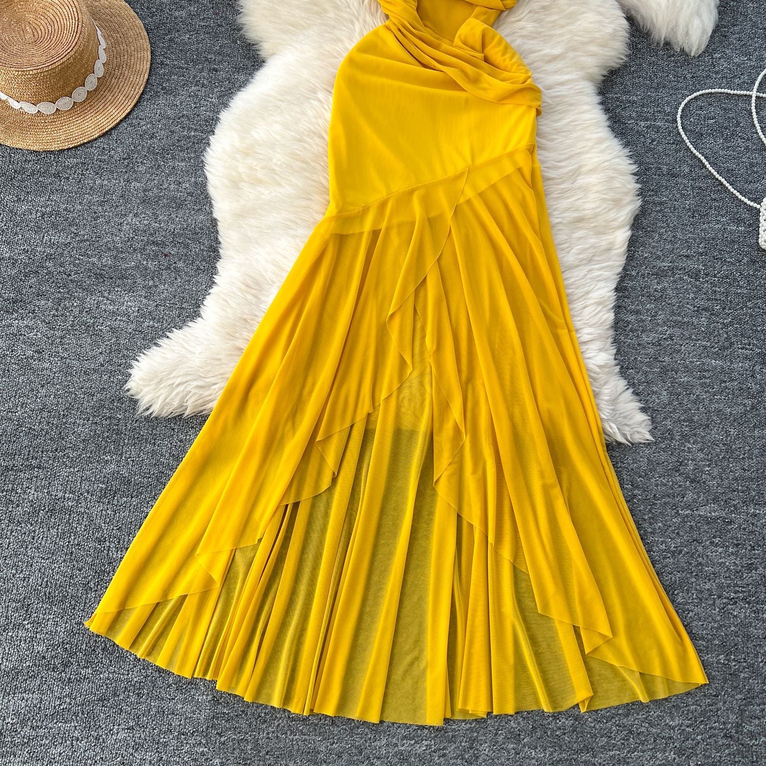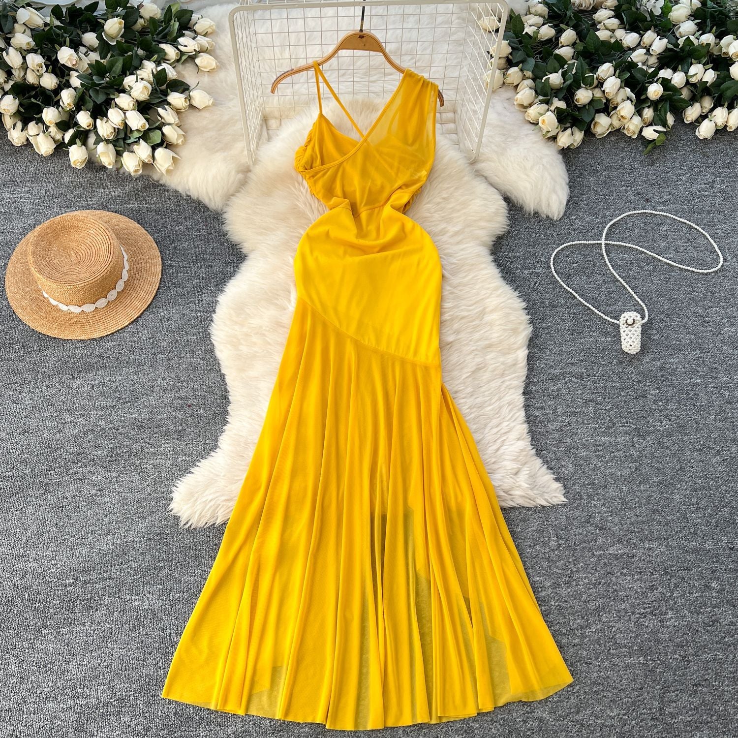 Yellow Dress Women's Holiday Dress 2025 New Heart Machine Shoulder Slings Irregular Bagged Dress